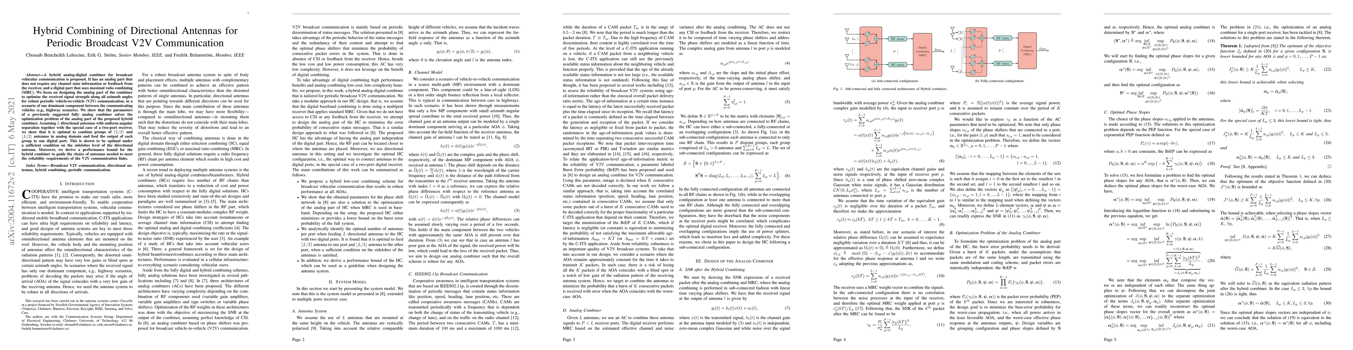 A hybrid analog-digital combiner for broadcast vehicular communication is proposed. It has an analog part that does not require any channel state information or feedback from the receiver, and a digital part that uses maximal ratio combining (MRC). We focus on designing the analog part of the combiner to optimize the received signal strength along all azimuth angles for robust periodic vehicle-to-vehicle (V2V) communication, in a scenario of one dominant component between the communicating vehicles (e.g., highway scenario). We show that the parameters of a previously suggested fully analog combiner solves the optimization problem of the analog part of the proposed hybrid combiner. Assuming $L$ directional antennas with uniform angular separation together with the special case of a two-port receiver, we show that it is optimal to combine groups of $\lceil L/2\rceil$ and $\lfloor L/2\rfloor$ antennas in analog domain and feed the output of each group to one digital port. This is shown to be optimal under a sufficient condition on the sidelobes level of the directional antenna. Moreover, we derive a performance bound for the hybrid combiner to guide the choice of antennas needed to meet the reliability requirements of the V2V communication links.