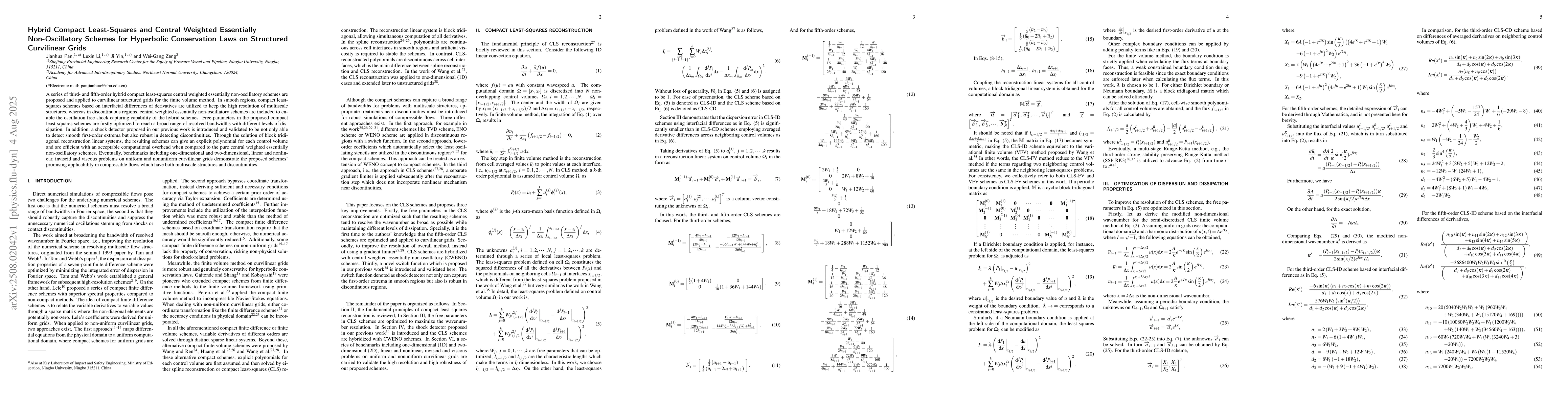 A series of third- and fifth-order hybrid compact least-squares central weighted essentially non-oscillatory schemes are proposed and applied to curvilinear structured grids for the finite volume method. In smooth regions, compact least-squares schemes based on interfacial differences of derivatives are utilized to keep the high resolution of multiscale structures, whereas in discontinuous regions, central weighted essentially non-oscillatory schemes are included to enable the oscillation free shock capturing capability of the hybrid schemes. Free parameters in the proposed compact least-squares schemes are firstly optimized to reach a broad range of resolved bandwidths with different levels of dissipation. In addition, a shock detector proposed in our previous work is introduced and validated to be not only able to detect smooth first-order extrema but also robust in detecting discontinuities. Through the solution of block tridiagonal reconstruction linear systems, the resulting schemes can give an explicit polynomial for each control volume and are efficient with an acceptable computational overhead when compared to the pure central weighted essentially non-oscillatory schemes. Eventually, benchmarks including one-dimensional and two-dimensional, linear and nonlinear, inviscid and viscous problems on uniform and nonuniform curvilinear grids demonstrate the proposed schemes' promising applicability in compressible flows which have both multiscale structures and discontinuities.