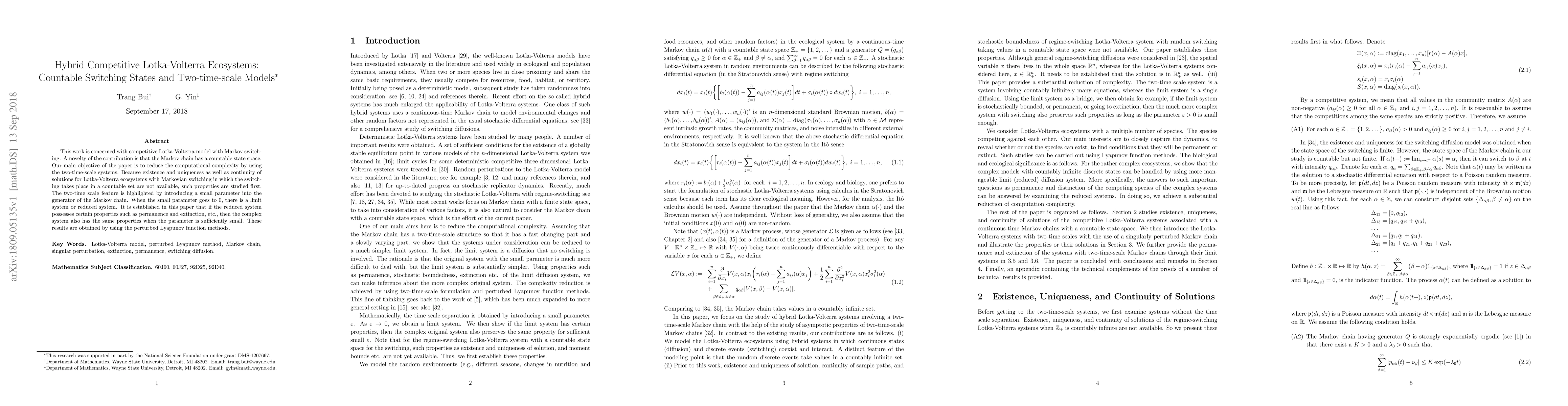 This paper studies competitive Lotka-Volterra ecosystems with countable Markov switching states, aiming to reduce computational complexity via two-time-scale models. It establishes properties like permanence and extinction for the complex system based on the reduced system's characteristics, using perturbed Lyapunov function methods.