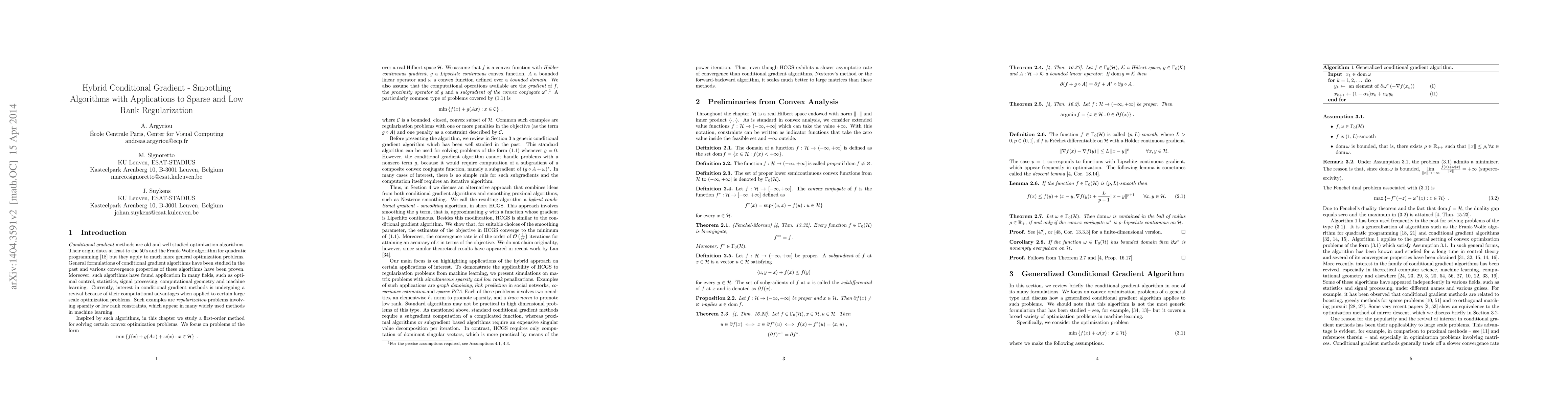 This paper introduces a hybrid conditional gradient-smoothing algorithm (HCGS) for solving composite convex optimization problems, particularly those involving sparse and low-rank regularization. The HCGS algorithm combines the efficiency of conditional gradient methods with the robustness of smoothing proximal methods, demonstrating improved performance on large scale optimization problems through simulations on matrix regularization and sparse PCA.