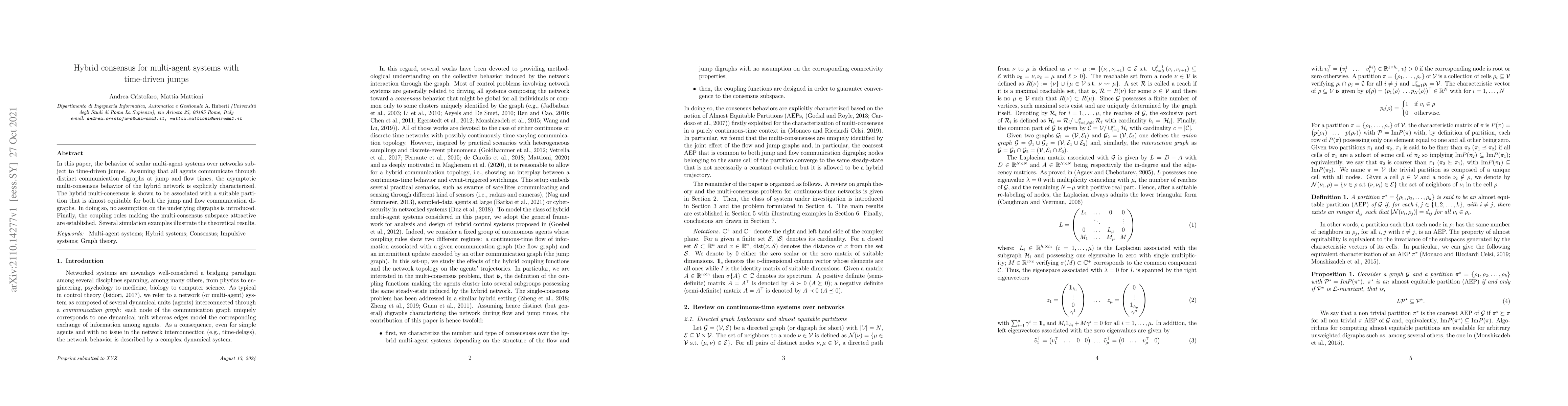 In this paper, the behavior of scalar multi-agent systems over networks subject to time-driven jumps. Assuming that all agents communicate through distinct communication digraphs at jump and flow times, the asymptotic multi-consensus behavior of the hybrid network is explicitly characterized. The hybrid multi-consensus is shown to be associated with a suitable partition that is almost equitable for both the jump and flow communication digraphs. In doing so, no assumption on the underlying digraphs is introduced. Finally, the coupling rules making the multi-consensus subspace attractive are established. Several simulation examples illustrate the theoretical results.