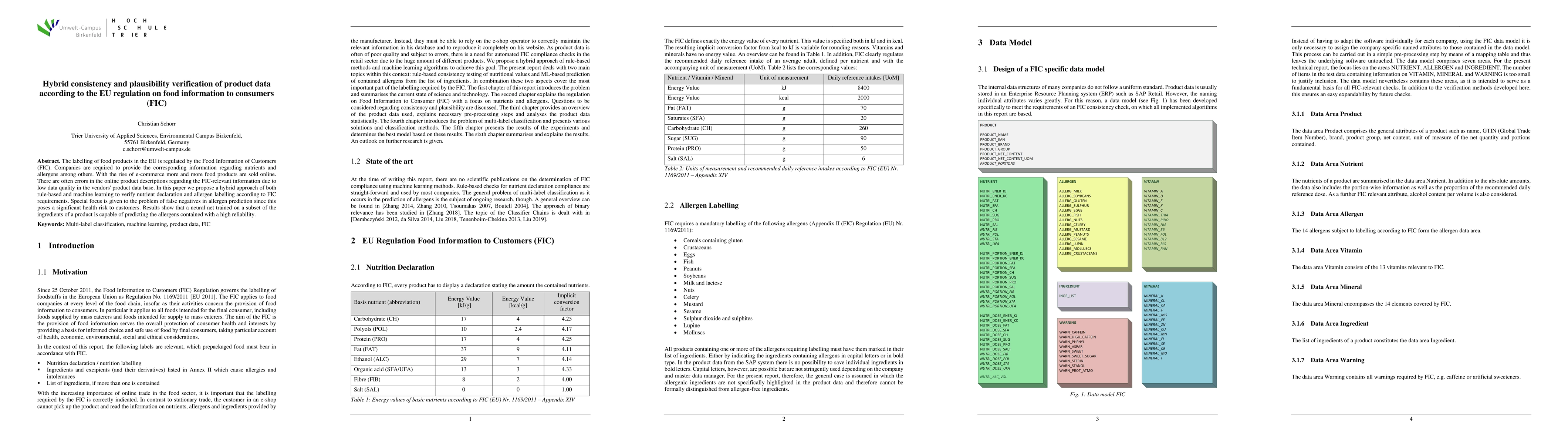 The labelling of food products in the EU is regulated by the Food Information of Customers (FIC). Companies are required to provide the corresponding information regarding nutrients and allergens among others. With the rise of e-commerce more and more food products are sold online. There are often errors in the online product descriptions regarding the FIC-relevant information due to low data quality in the vendors' product data base. In this paper we propose a hybrid approach of both rule-based and machine learning to verify nutrient declaration and allergen labelling according to FIC requirements. Special focus is given to the problem of false negatives in allergen prediction since this poses a significant health risk to customers. Results show that a neural net trained on a subset of the ingredients of a product is capable of predicting the allergens contained with a high reliability.