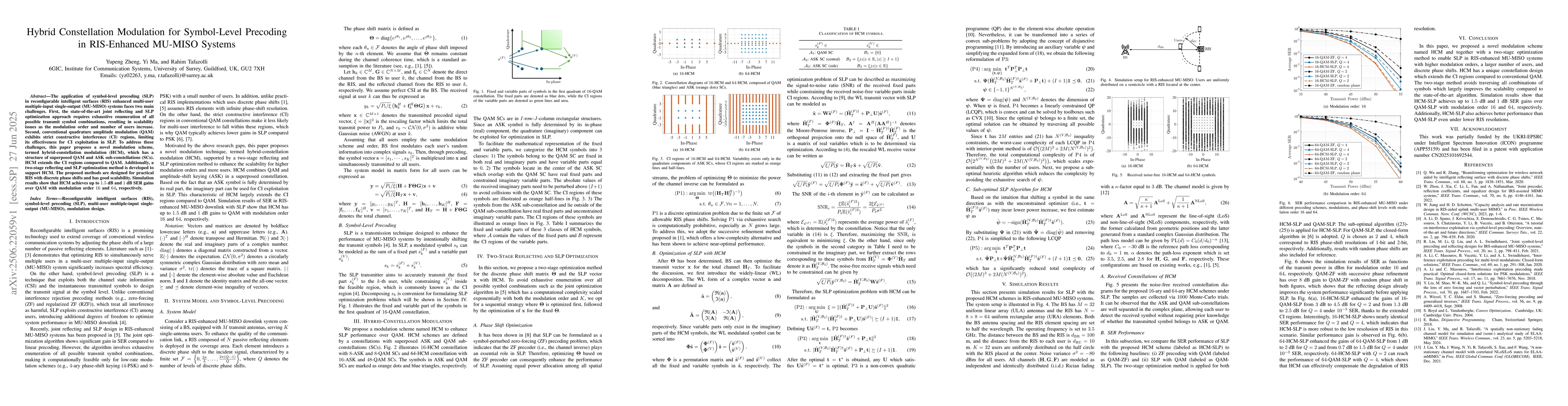 This paper proposes Hybrid Constellation Modulation (HCM) for Symbol-Level Precoding (SLP) in RIS-enhanced MU-MISO systems, addressing scalability and CI limitations of QAM. HCM combines QAM and ASK SCs, extending CI regions. A two-stage reflecting and SLP optimization method supports HCM, showing up to 1.5 dB SER gains over QAM with modulation order 16, and 1 dB with order 64.