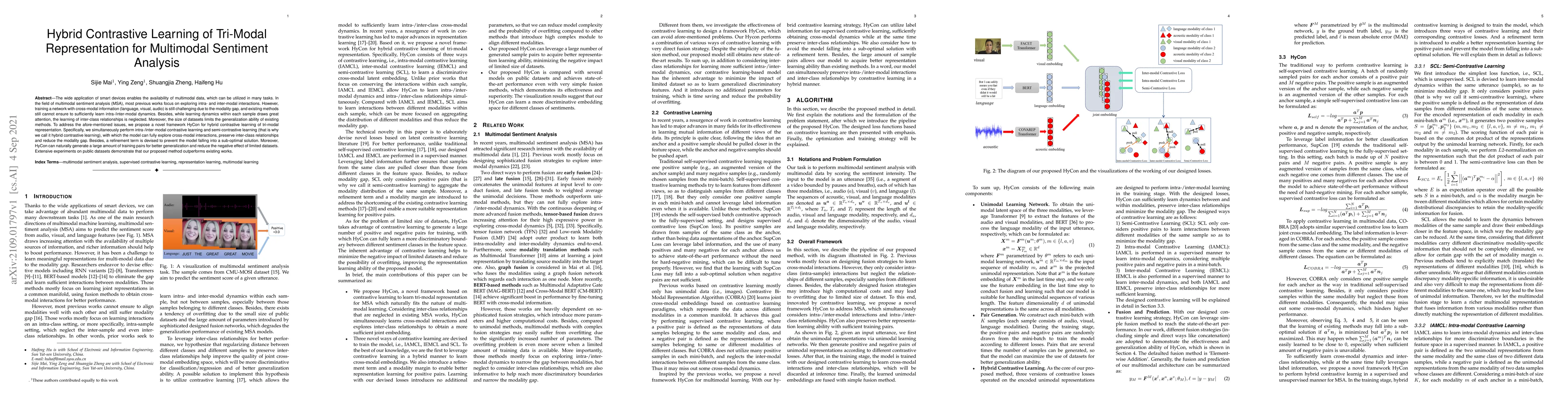 This paper proposes HyCon, a hybrid contrastive learning framework for tri-modal representation in multimodal sentiment analysis, which simultaneously performs intra-/inter-modal and semi-contrastive learning to explore cross-modal interactions, preserve inter-class relationships, and reduce the modality gap. The method also generates training pairs to improve generalization and outperforms existing methods in experiments.