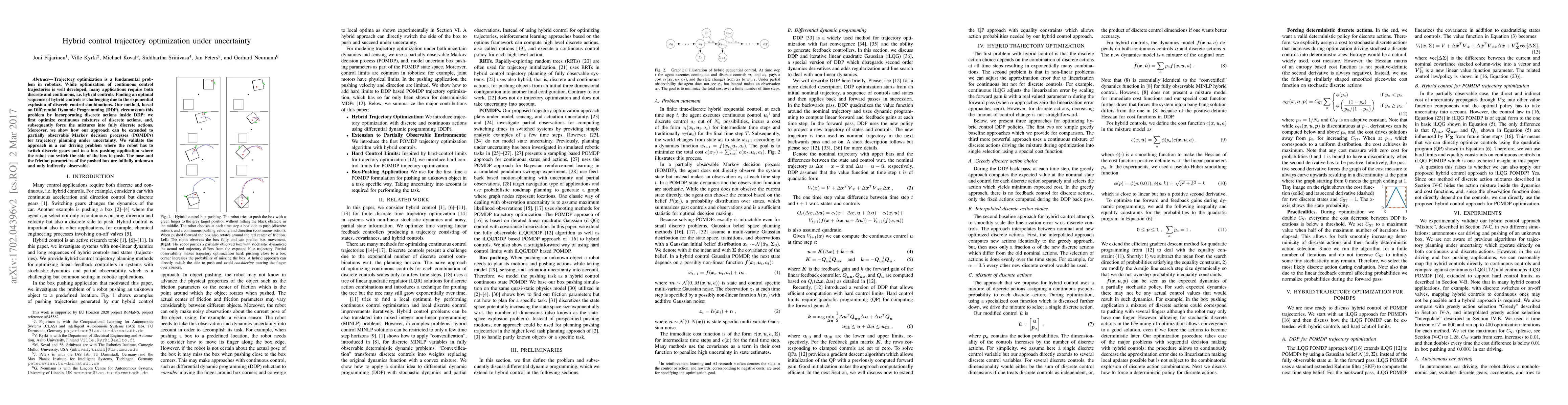This paper proposes a hybrid control trajectory optimization method using Differential Dynamic Programming (DDP) to handle both discrete and continuous controls efficiently. The approach optimizes continuous mixtures of discrete actions and then converts them into fully discrete actions, extending the solution to partially observable environments. The method is validated in car driving and box pushing scenarios with uncertain parameters.