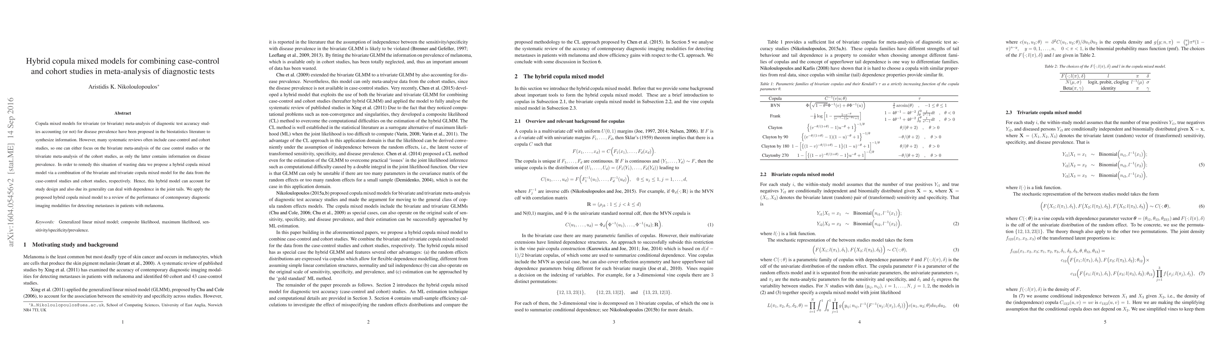 This paper proposes a hybrid copula mixed model to combine case-control and cohort studies in meta-analysis of diagnostic tests, addressing the issue of data wastage by integrating both study designs. The model accounts for disease prevalence and dependence in joint tails, demonstrated through a review of diagnostic imaging for melanoma metastases.