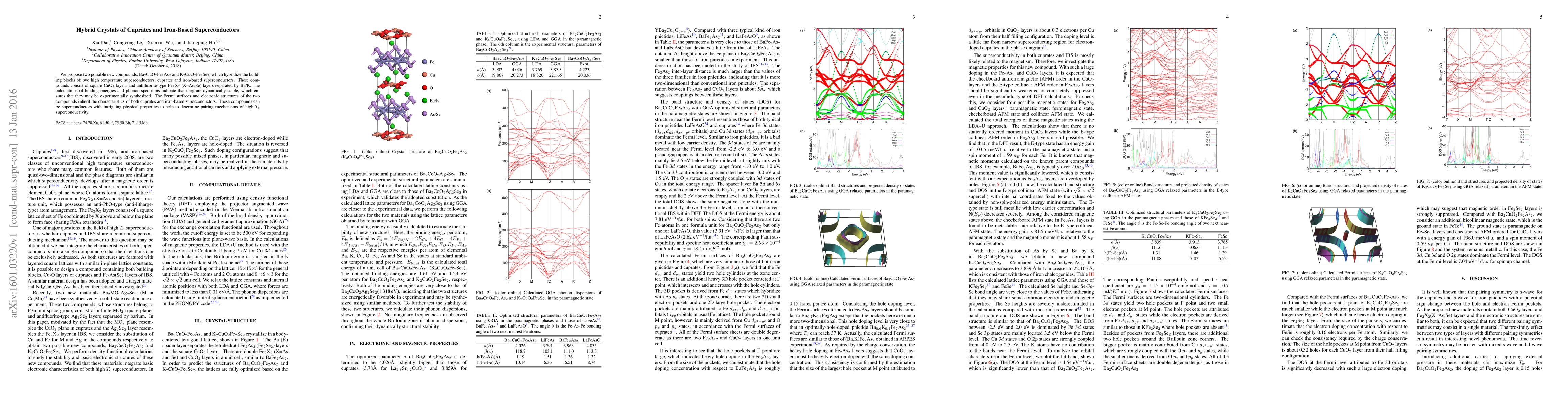 This paper proposes two new hybrid compounds, Ba$_2$CuO$_2$Fe$_2$As$_2$ and K$_2$CuO$_2$Fe$_2$Se$_2$, combining elements from cuprate and iron-based superconductors. Theoretical calculations suggest these compounds are dynamically stable and could be synthesized, potentially exhibiting unique superconducting properties that may aid in understanding high-temperature superconductivity mechanisms.