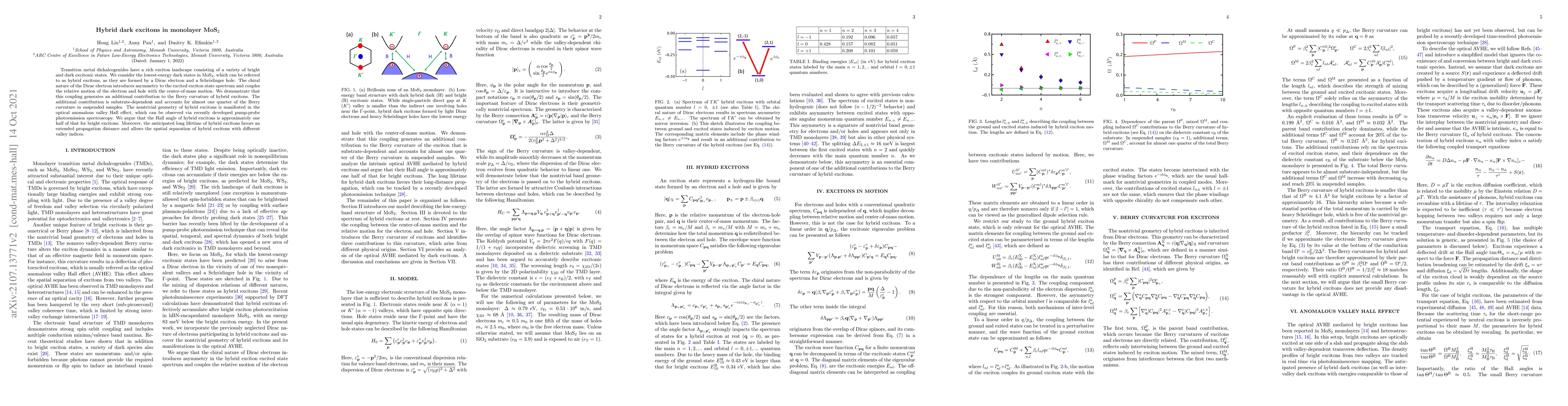 Transition metal dichalcogenides have a rich exciton landscape consisting of a variety of bright and dark excitonic states. We consider the lowest-energy dark states in $\hbox{MoS}_2$, which can be referred to as hybrid excitons, as they are formed by a Dirac electron and a Schr\"{o}dinger hole. The chiral nature of the Dirac electron introduces asymmetry to the excited exciton state spectrum and entangles the relative motion of the electron and hole with the center-of-mass motion. We demonstrate that the entanglement generates an additional contribution to the Berry curvature of hybrid excitons. The additional contribution is substrate-dependent and accounts for almost one quarter of the Berry curvature in suspended samples. The nontrivial geometry of hybrid excitons is manifested in the optical anomalous valley Hall effect, which can be observed via recently developed pump-probe photoemission spectroscopy. We argue that the Hall angle of hybrid excitons is approximately one half of that for bright excitons. Moreover, the anticipated long lifetime of hybrid excitons favors an extended propagation distance and allows the spatial separation of hybrid excitons with different valley indices.