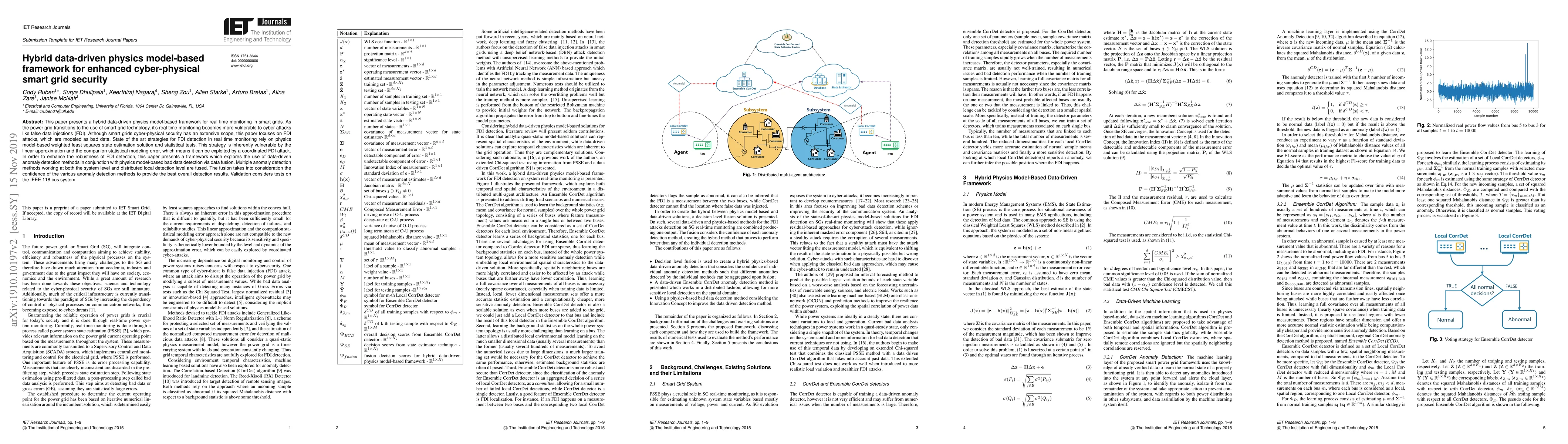This paper presents a hybrid data-driven physics model-based framework for real time monitoring in smart grids. As the power grid transitions to the use of smart grid technology, it's real time monitoring becomes more vulnerable to cyber attacks like false data injections (FDI). Although smart grids cyber-physical security has an extensive scope, this paper focuses on FDI attacks, which are modeled as bad data. State of the art strategies for FDI detection in real time monitoring rely on physics model-based weighted least squares state estimation solution and statistical tests. This strategy is inherently vulnerable by the linear approximation and the companion statistical modeling error, which means it can be exploited by a coordinated FDI attack. In order to enhance the robustness of FDI detection, this paper presents a framework which explores the use of data-driven anomaly detection methods in conjunction with physics model-based bad data detection via data fusion. Multiple anomaly detection methods working at both the system level and distributed local detection level are fused. The fusion takes into consideration the confidence of the various anomaly detection methods to provide the best overall detection results. Validation considers tests on the IEEE 118 bus system.