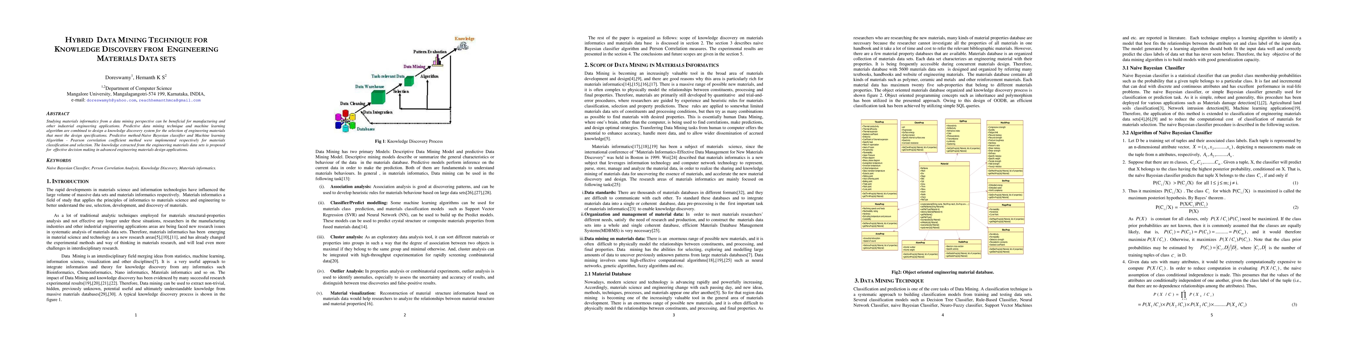 This paper proposes a hybrid data mining technique combining predictive methods and machine learning algorithms to discover knowledge from engineering materials datasets, aiming to enhance decision-making in advanced materials design through the use of a Naive Bayesian classifier and Pearson correlation coefficient method. The results offer a robust system for selecting materials that meet specific design requirements.