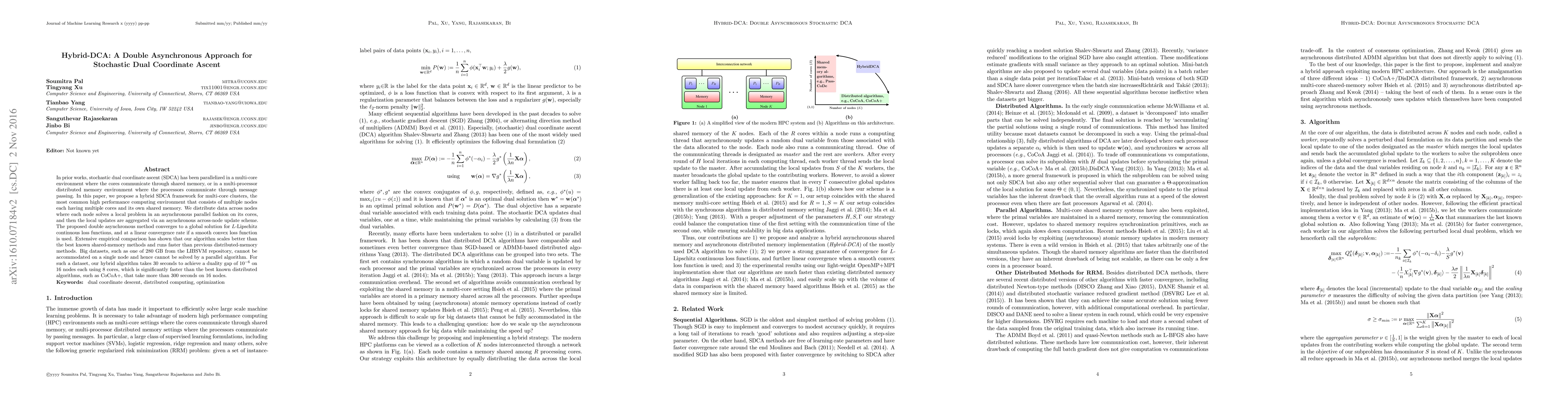 In prior works, stochastic dual coordinate ascent (SDCA) has been parallelized in a multi-core environment where the cores communicate through shared memory, or in a multi-processor distributed memory environment where the processors communicate through message passing. In this paper, we propose a hybrid SDCA framework for multi-core clusters, the most common high performance computing environment that consists of multiple nodes each having multiple cores and its own shared memory. We distribute data across nodes where each node solves a local problem in an asynchronous parallel fashion on its cores, and then the local updates are aggregated via an asynchronous across-node update scheme. The proposed double asynchronous method converges to a global solution for $L$-Lipschitz continuous loss functions, and at a linear convergence rate if a smooth convex loss function is used. Extensive empirical comparison has shown that our algorithm scales better than the best known shared-memory methods and runs faster than previous distributed-memory methods. Big datasets, such as one of 280 GB from the LIBSVM repository, cannot be accommodated on a single node and hence cannot be solved by a parallel algorithm. For such a dataset, our hybrid algorithm takes 30 seconds to achieve a duality gap of $10^{-6}$ on 16 nodes each using 8 cores, which is significantly faster than the best known distributed algorithms, such as CoCoA+, that take more than 300 seconds on 16 nodes.