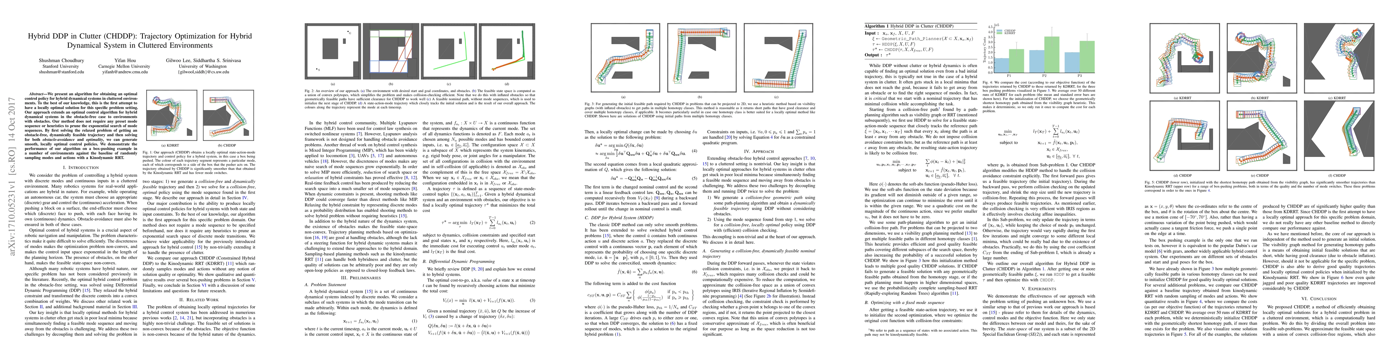 This paper introduces a novel algorithm, Hybrid DDP in Clutter (CHDDP), for optimizing control policies in hybrid dynamical systems within cluttered environments. Unlike previous methods, CHDDP generates locally optimal control policies without preset sequences or heuristics, by first finding an obstacle-free, dynamically feasible trajectory and then solving for both obstacle avoidance and optimality.