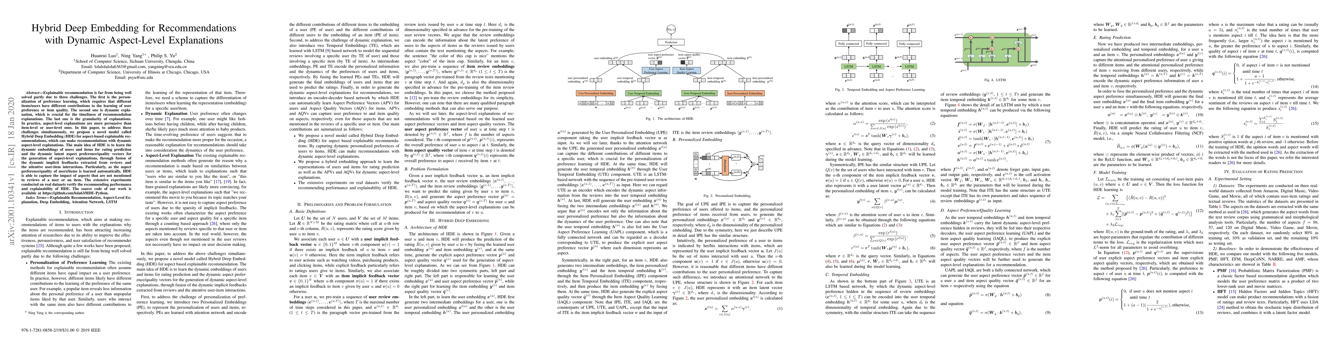 This paper proposes a Hybrid Deep Embedding (HDE) model for aspect-based explainable recommendations, addressing personalization, dynamic explanations, and granularity of explanations. HDE dynamically learns user and item embeddings and aspect-level preferences/qualities to generate timely aspect-level explanations, capturing unmentioned aspects. Experiments on real datasets demonstrate HDE's performance and explainability.