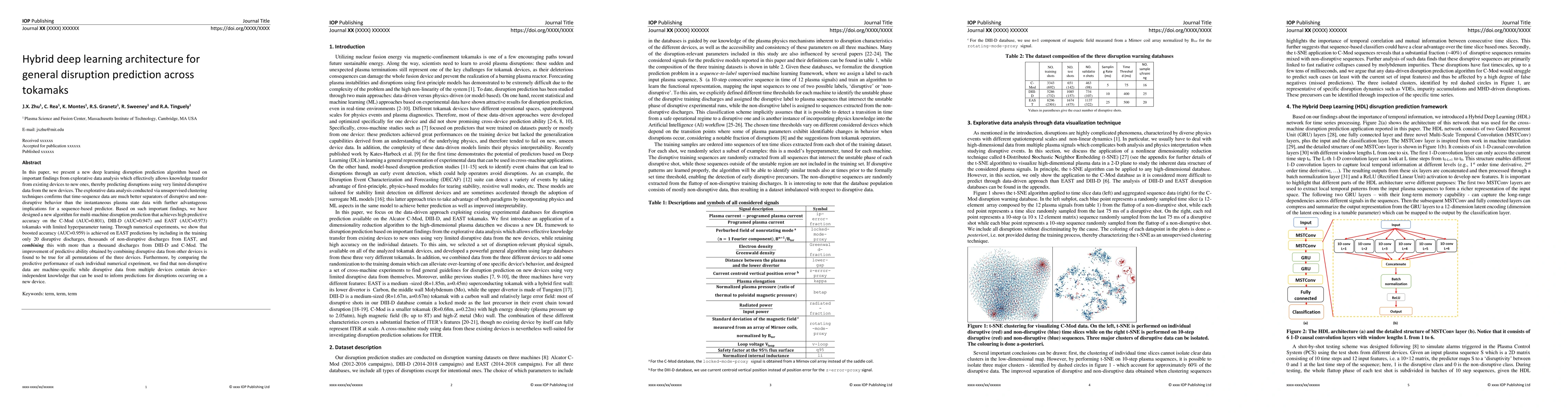 This paper introduces a hybrid deep learning architecture for predicting disruptions in tokamaks using limited data from new devices. The algorithm leverages unsupervised clustering and time-sequence data for high predictive accuracy across multiple tokamaks, demonstrating improved performance by combining data from different devices.