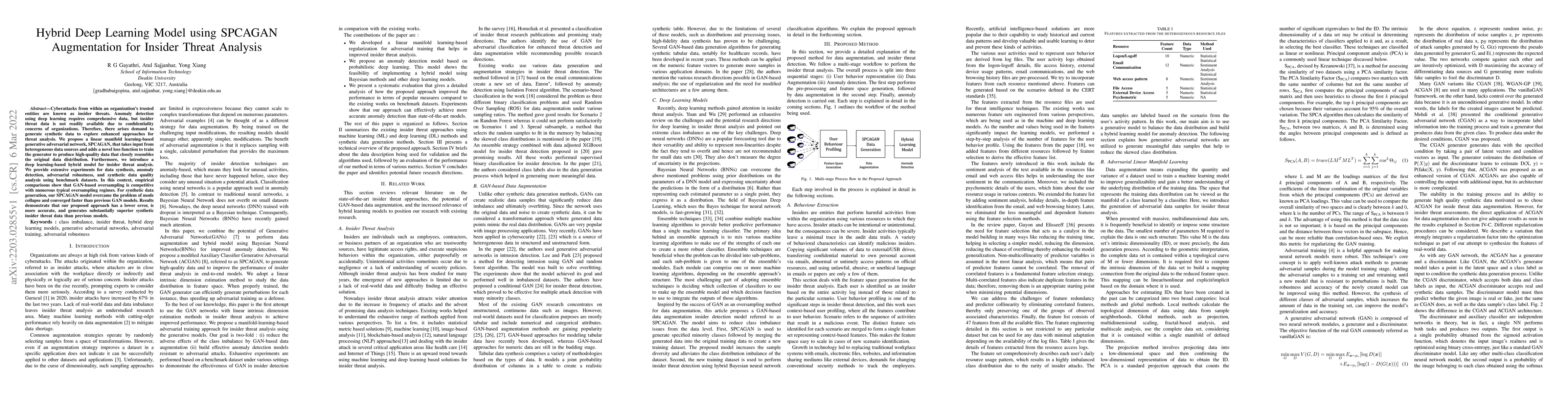 This research proposes a hybrid deep learning model using SPCAGAN for generating synthetic data to enhance insider threat analysis, addressing the scarcity of insider threat data. SPCAGAN outperforms previous GAN models in synthetic data quality, leading to more accurate anomaly detection and robust threat analysis.