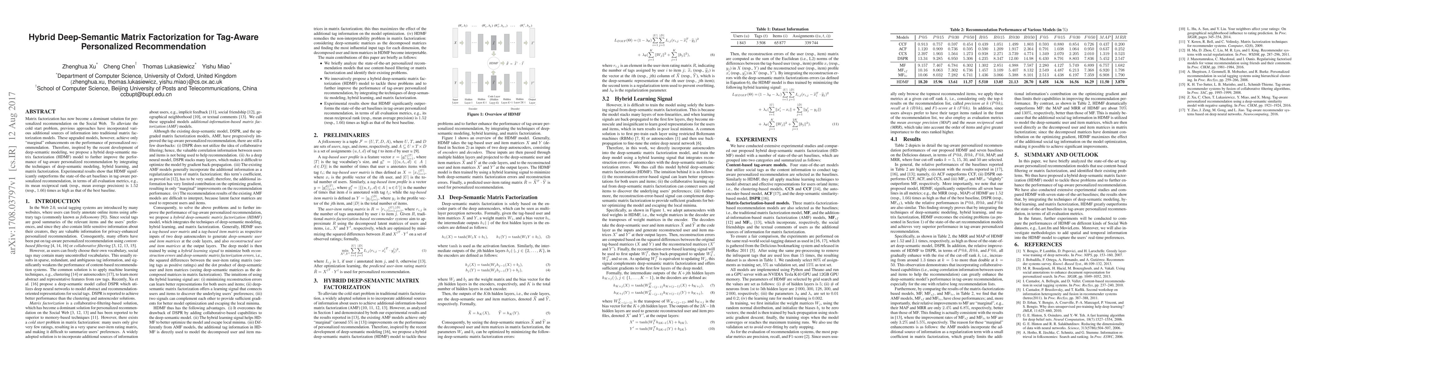The paper proposes a hybrid deep-semantic matrix factorization (HDMF) model to enhance tag-aware personalized recommendation, integrating deep-semantic modeling, hybrid learning, and matrix factorization to overcome cold start issues and outperform existing methods, achieving significantly higher mean reciprocal rank and mean average precision.