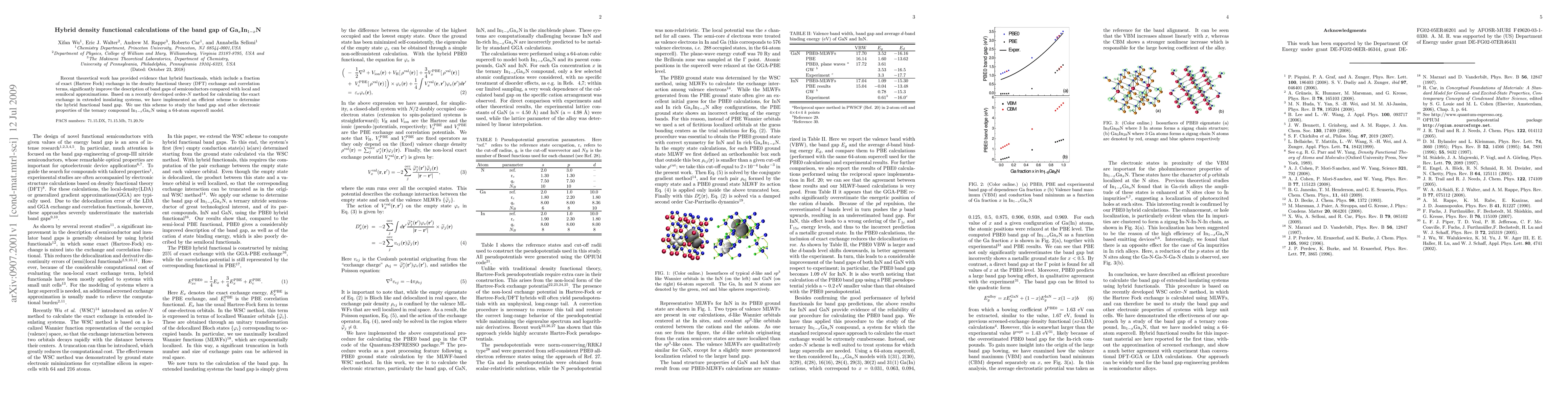 This paper investigates the band gap of Ga$_x$In$_{1-x}$N using hybrid density functional theory, which combines exact exchange with DFT, to achieve more accurate results compared to local approximations. The study employs an efficient computational scheme based on a recently developed order-$N$ method to analyze the electronic properties of the ternary compound.