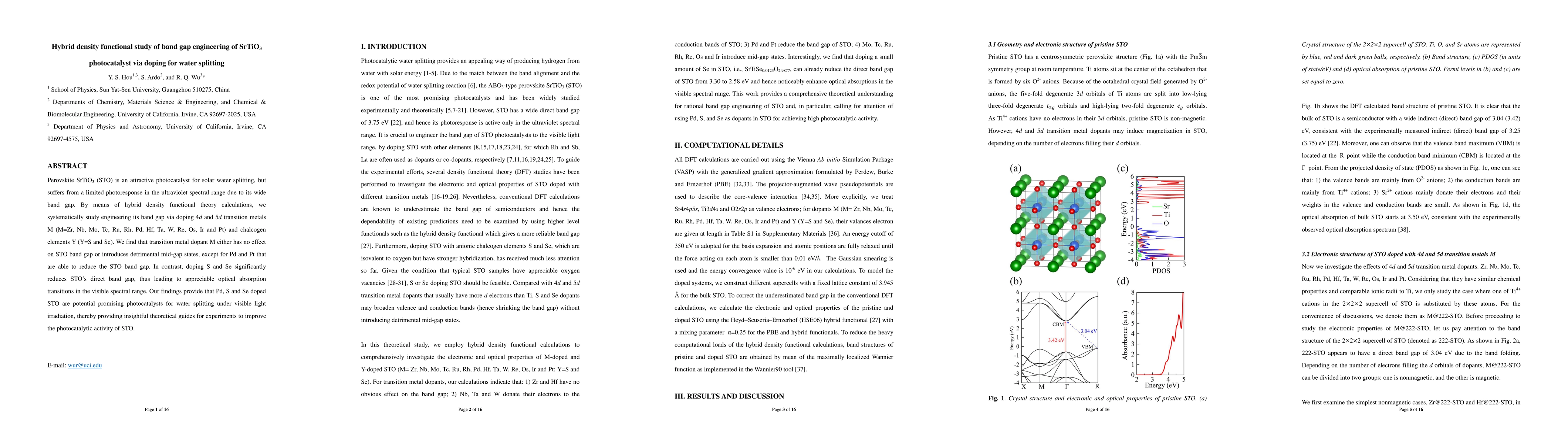 This study investigates SrTiO3 photocatalyst doping using hybrid density functional theory to enhance its photoresponse for water splitting. The research finds that while most dopants have negligible or negative effects, Pd and Pt reduce the band gap, and S and Se significantly lower it, suggesting Pd, S, and Se doped SrTiO3 as promising candidates for visible light-driven water splitting.