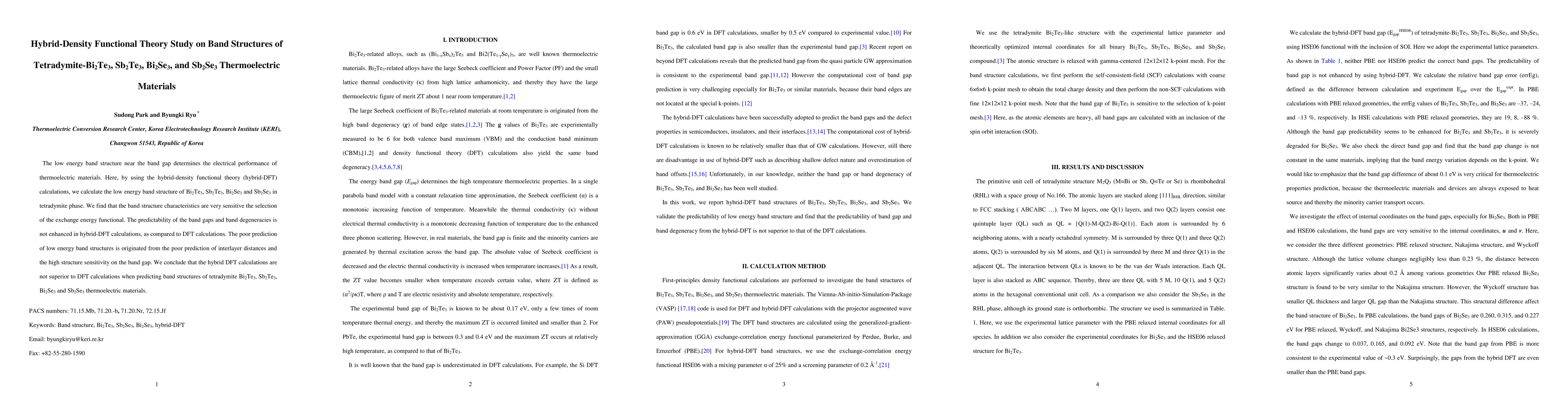 This study uses hybrid-DFT to analyze the band structures of thermoelectric materials Bi2Te3, Sb2Te3, Bi2Se3, and Sb2Se3 in tetradymite phase, finding that hybrid-DFT does not outperform DFT in predicting band gaps and degeneracies due to its poor prediction of interlayer distances and high structure sensitivity.