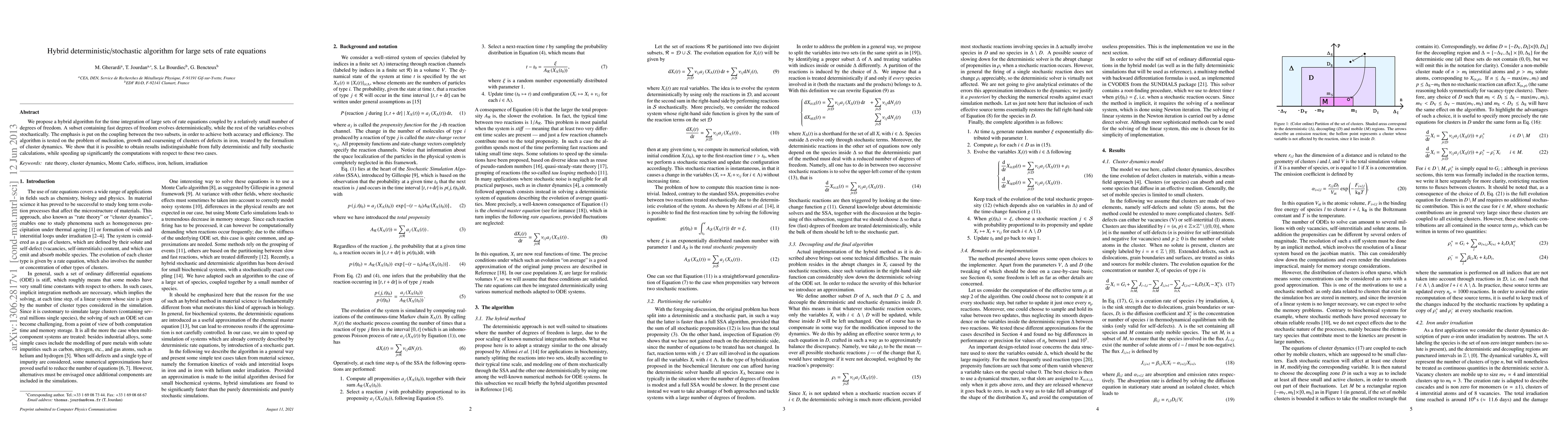 We propose a hybrid algorithm for the time integration of large sets of rate equations coupled by a relatively small number of degrees of freedom. A subset containing fast degrees of freedom evolves deterministically, while the rest of the variables evolves stochastically. The emphasis is put on the coupling between the two subsets, in order to achieve both accuracy and efficiency. The algorithm is tested on the problem of nucleation, growth and coarsening of clusters of defects in iron, treated by the formalism of cluster dynamics. We show that it is possible to obtain results indistinguishable from fully deterministic and fully stochastic calculations, while speeding up significantly the computations with respect to these two cases.