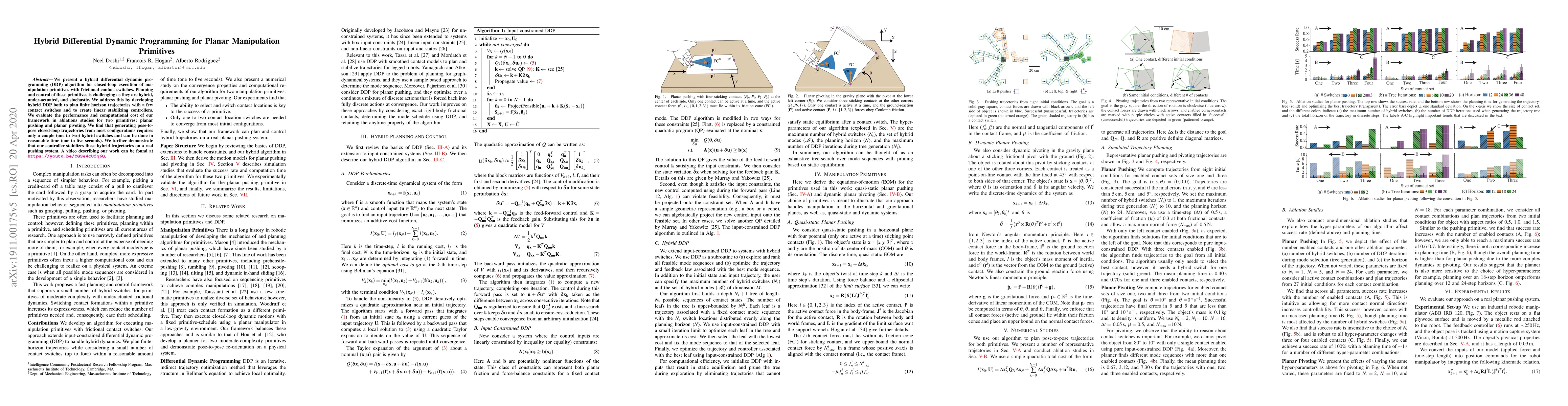 This paper introduces a hybrid differential dynamic programming (DDP) algorithm for planning and controlling planar manipulation primitives with frictional contact switches. The method efficiently generates finite horizon trajectories with minimal contact switches and stabilizes them, demonstrated through planar pushing and pivoting tasks.