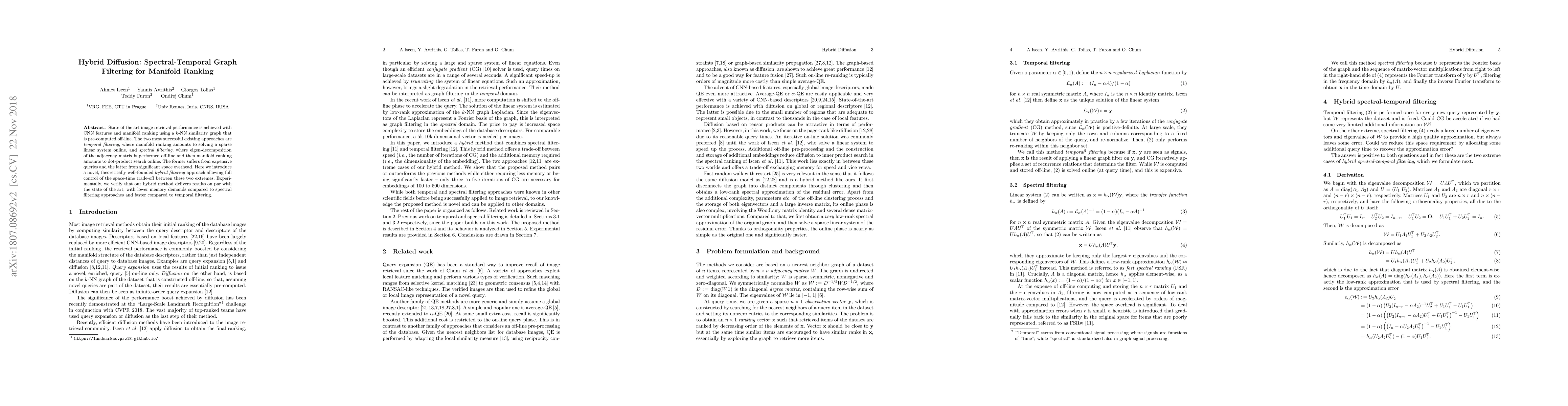 This paper proposes a hybrid spectral-temporal graph filtering method for manifold ranking in image retrieval, balancing the trade-off between space and time efficiency. The hybrid approach achieves state-of-the-art performance with lower memory usage and faster query times compared to existing spectral and temporal filtering methods.