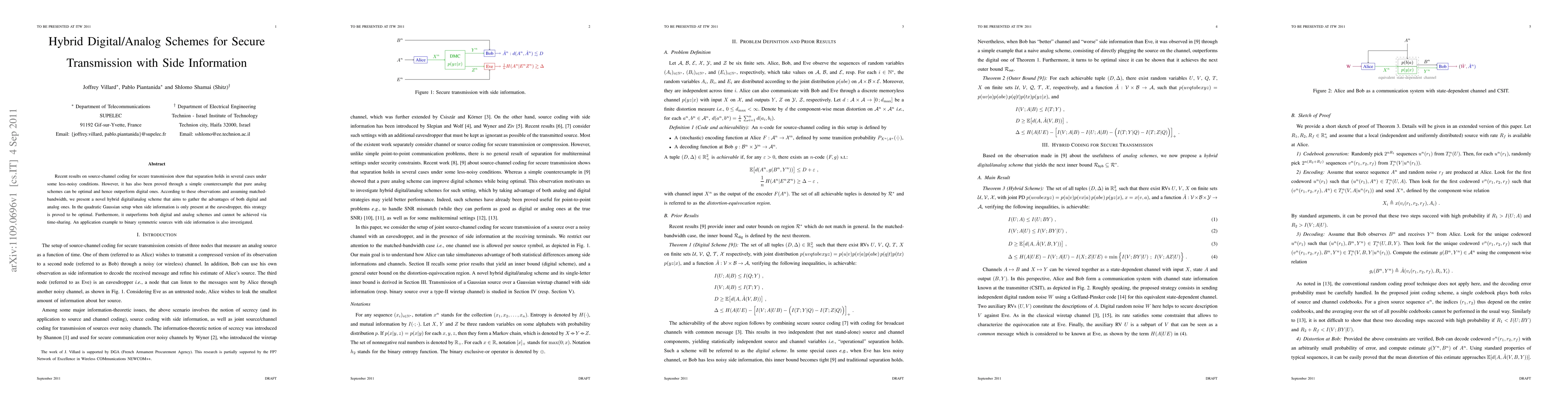 This paper proposes a hybrid digital/analog scheme for secure transmission that leverages the benefits of both methods, proving its optimality in the quadratic Gaussian setup with side information only at the eavesdropper. It outperforms both pure digital and analog schemes and cannot be achieved through time-sharing, with an application example provided for binary symmetric sources.