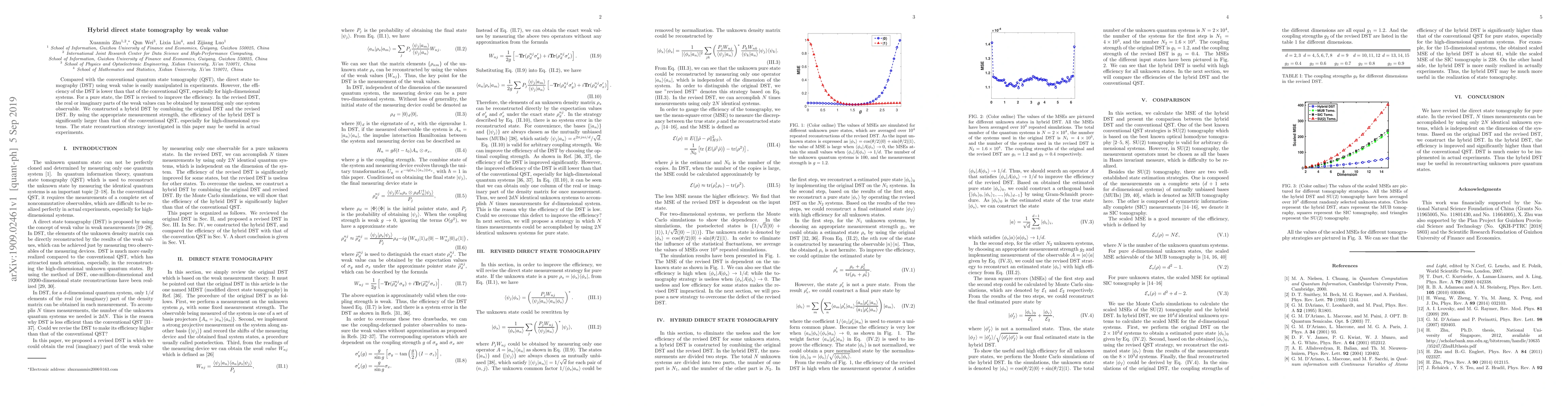 This paper proposes a hybrid direct state tomography method using weak value to improve efficiency over conventional quantum state tomography, especially for high-dimensional systems. The hybrid approach combines traditional and revised direct state tomography techniques, achieving significantly higher efficiency by measuring only one system observable.
