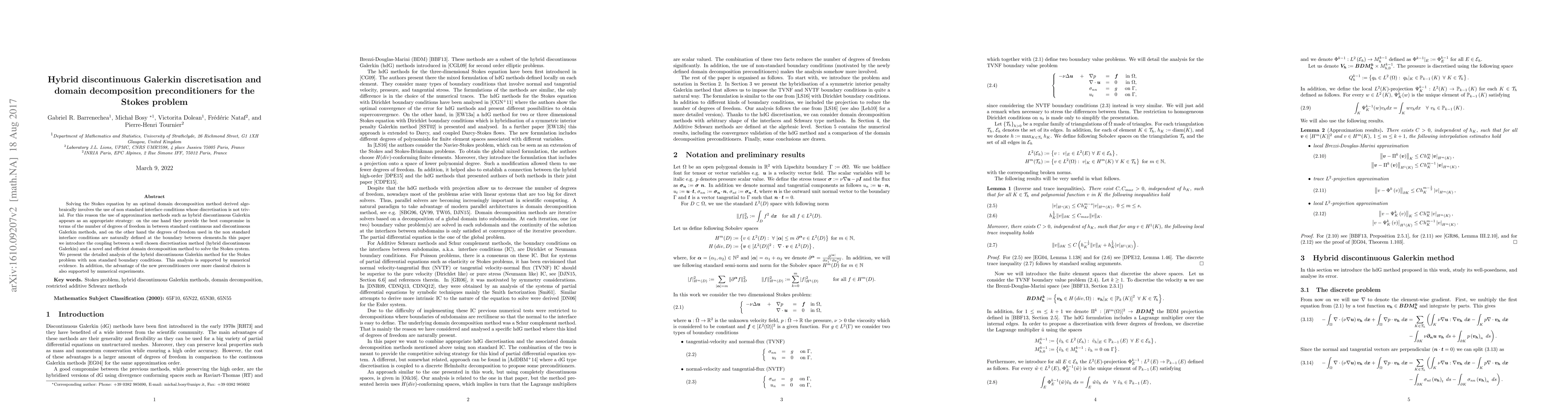 This paper introduces a hybrid discontinuous Galerkin discretisation coupled with a novel domain decomposition method to efficiently solve the Stokes problem, demonstrating advantages over classical preconditioners through numerical analysis and experiments.