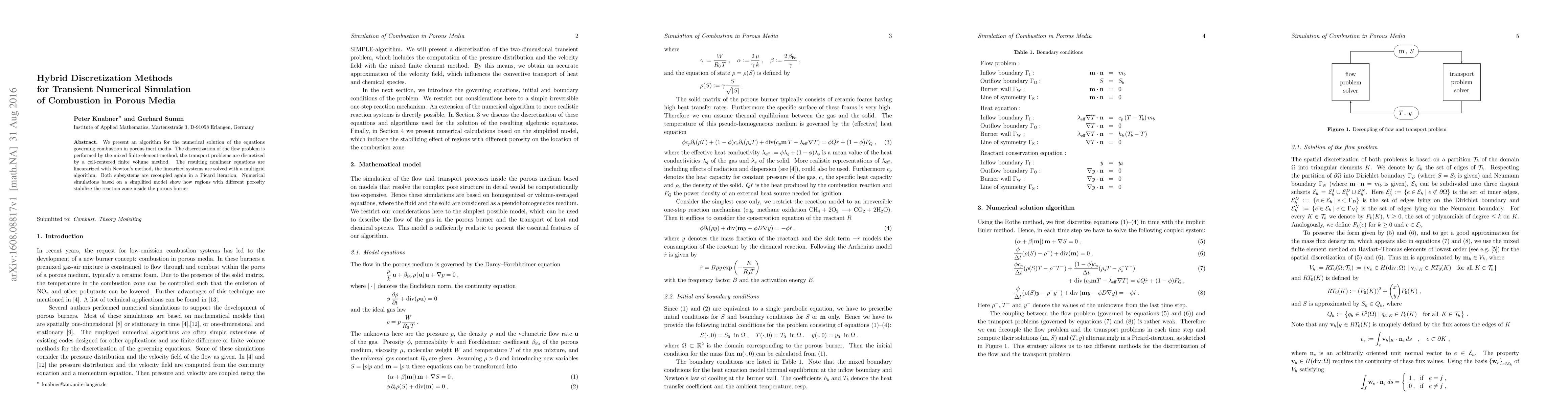 The paper introduces hybrid discretization methods for transient numerical simulation of combustion in porous media, combining mixed finite elements for flow problems and cell-centered finite volumes for transport problems.