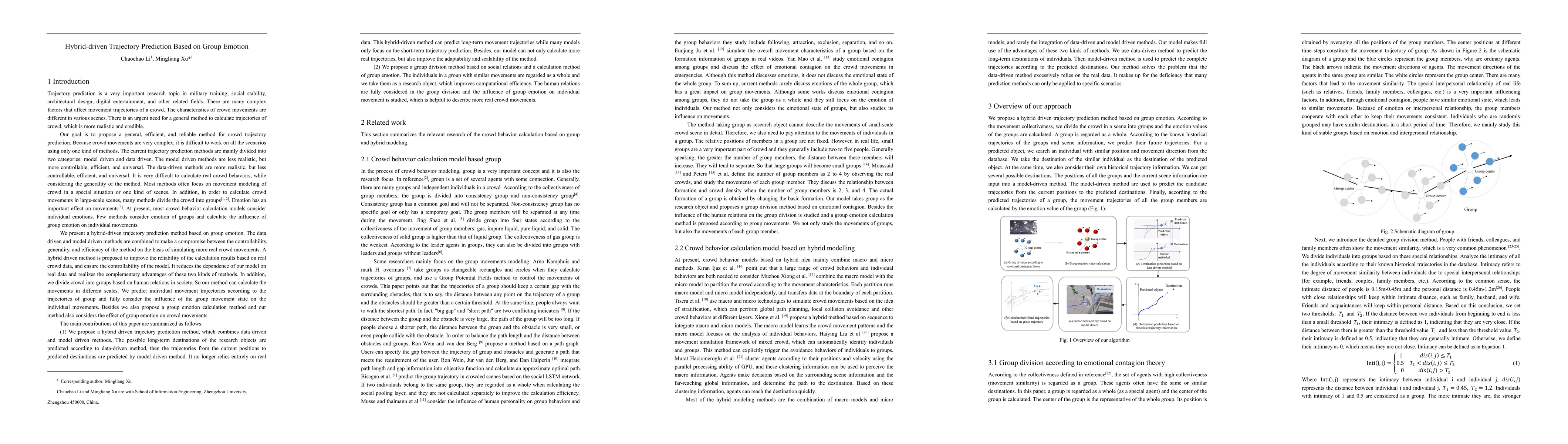 This paper proposes a hybrid-driven trajectory prediction method that combines data-driven and model-driven approaches to simulate realistic crowd movements. The method considers group emotions and human relations to predict individual movement trajectories based on group dynamics.