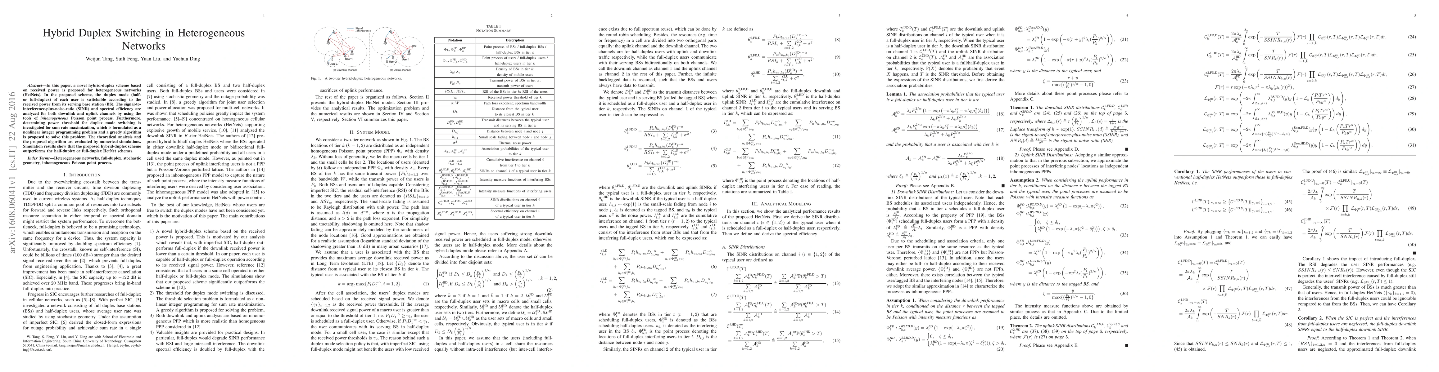 This paper proposes a hybrid-duplex scheme for heterogeneous networks where user duplex mode switches based on received power from the base station. The scheme aims to maximize sum rate through a power threshold determination, analyzed using inhomogeneous Poisson point process, and solved via a proposed greedy algorithm. Simulation results indicate superior performance of the hybrid-duplex scheme over traditional half-duplex or full-duplex methods.