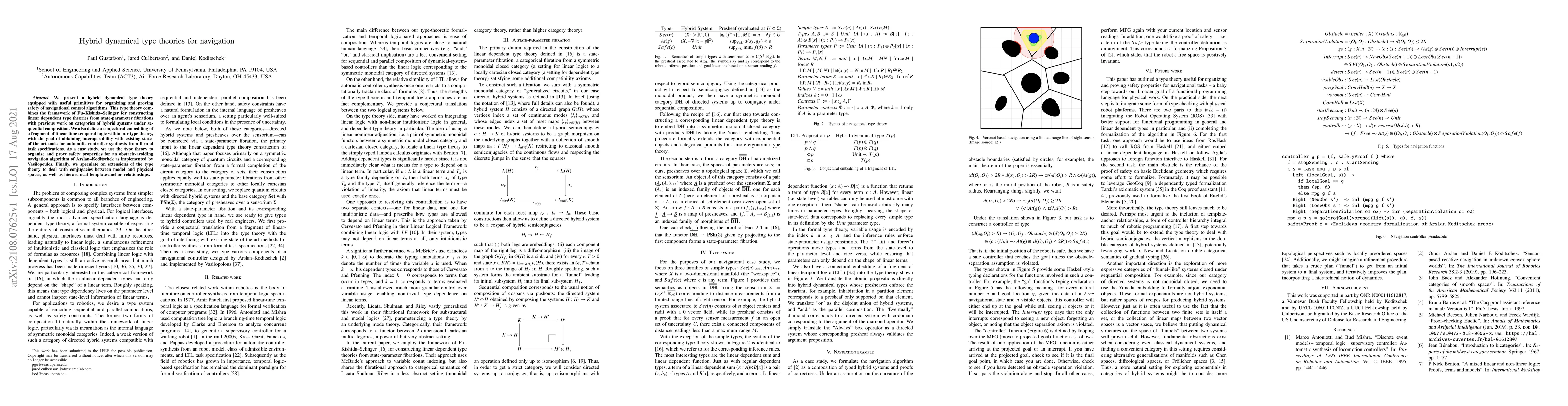 We present a hybrid dynamical type theory equipped with useful primitives for organizing and proving safety of navigational control algorithms. This type theory combines the framework of Fu--Kishida--Selinger for constructing linear dependent type theories from state-parameter fibrations with previous work on categories of hybrid systems under sequential composition. We also define a conjectural embedding of a fragment of linear-time temporal logic within our type theory, with the goal of obtaining interoperability with existing state-of-the-art tools for automatic controller synthesis from formal task specifications. As a case study, we use the type theory to organize and prove safety properties for an obstacle-avoiding navigation algorithm of Arslan--Koditschek as implemented by Vasilopoulos. Finally, we speculate on extensions of the type theory to deal with conjugacies between model and physical spaces, as well as hierarchical template-anchor relationships.