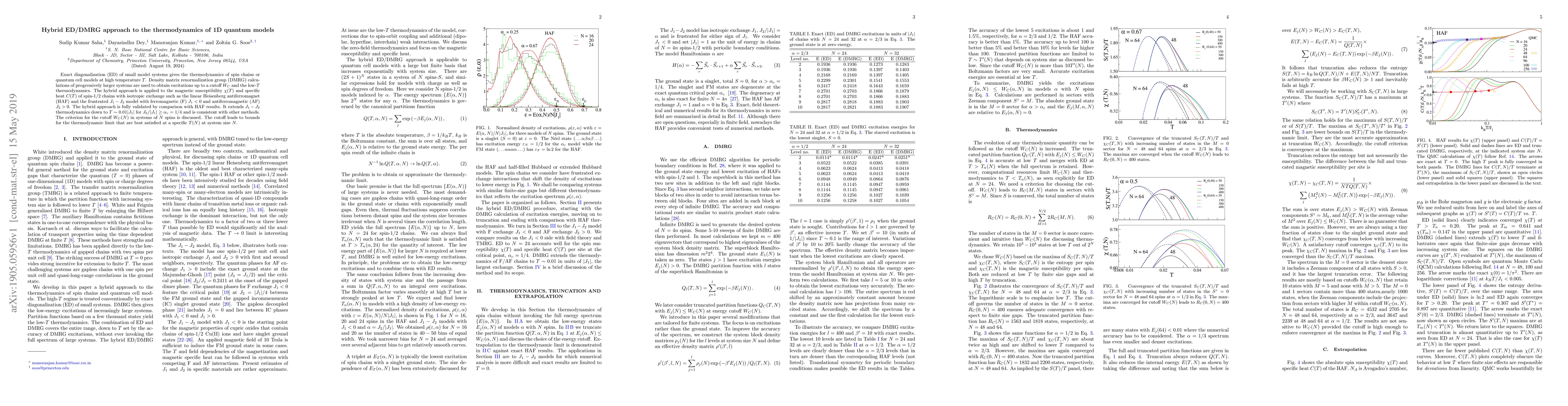 This research paper presents a hybrid approach combining exact diagonalization and density matrix renormalization group to study thermodynamics of 1D quantum models at high and low temperatures, with key findings including accurate calculations down to T ~ 0.01|J1|.