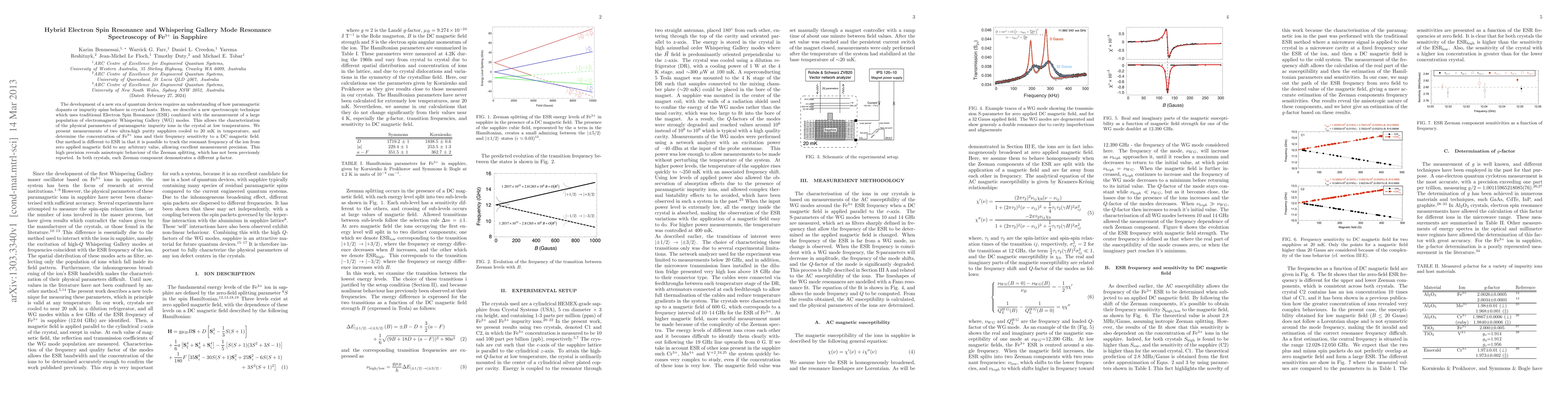 The development of a new era of quantum devices requires an understanding of how paramagnetic dopants or impurity spins behave in crystal hosts. Here, we describe a new spectroscopic technique which uses traditional Electron Spin Resonance (ESR) combined with the measurement of a large population of electromagnetic Whispering Gallery (WG) modes. This allows the characterization of the physical parameters of paramagnetic impurity ions in the crystal at low temperatures. We present measurements of two ultra-high purity sapphires cooled to 20 mK in temperature, and determine the concentration of Fe3+ ions and their frequency sensitivity to a DC magnetic field. Our method is different to ESR in that it is possible to track the resonant frequency of the ion from zero applied magnetic field to any arbitrary value, allowing excellent measurement precision. This high precision reveals anisotropic behaviour of the Zeeman splitting, which has not been previously reported. In both crystals, each Zeeman component demonstrates a different g-factor.