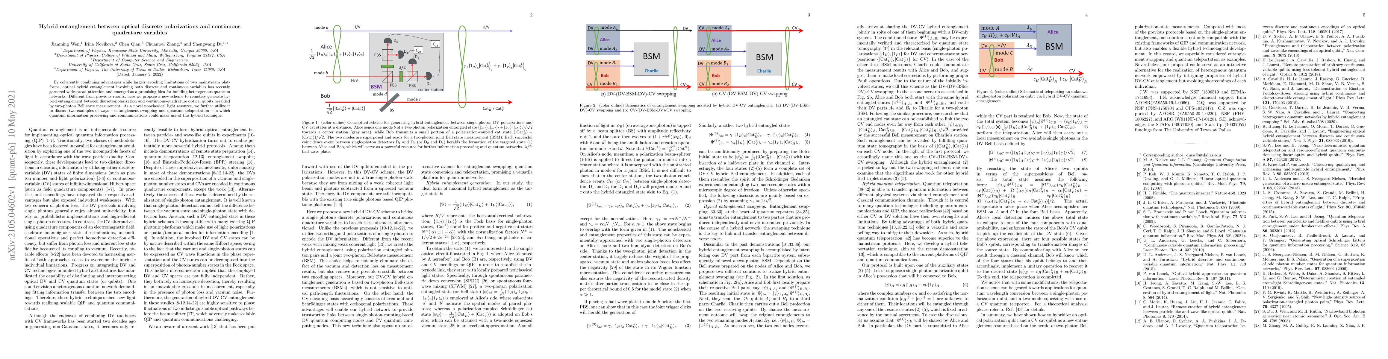 This paper proposes a new scheme for generating hybrid entanglement between discrete polarization and continuous quadrature optical qubits, leveraging two-photon Bell state measurement. It explores applications of this novel resource in quantum information processing, including entanglement swapping and quantum teleportation.
