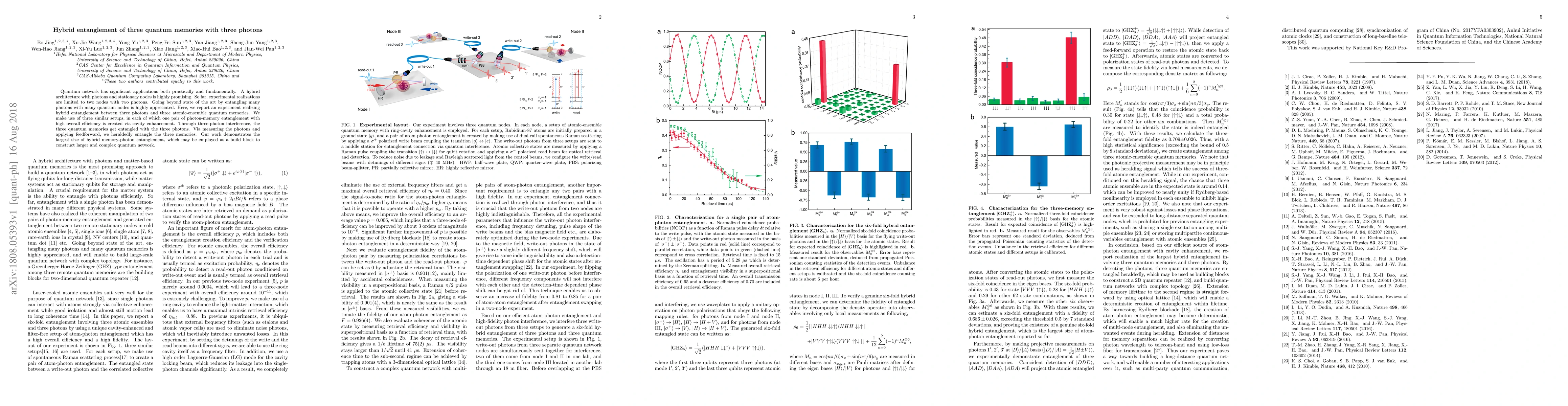 This research paper reports an experiment successfully achieving hybrid entanglement between three photons and three atomic-ensemble quantum memories using cavity enhancement and feedforward techniques, marking the largest such entanglement realized to date and serving as a foundational step for larger quantum networks.