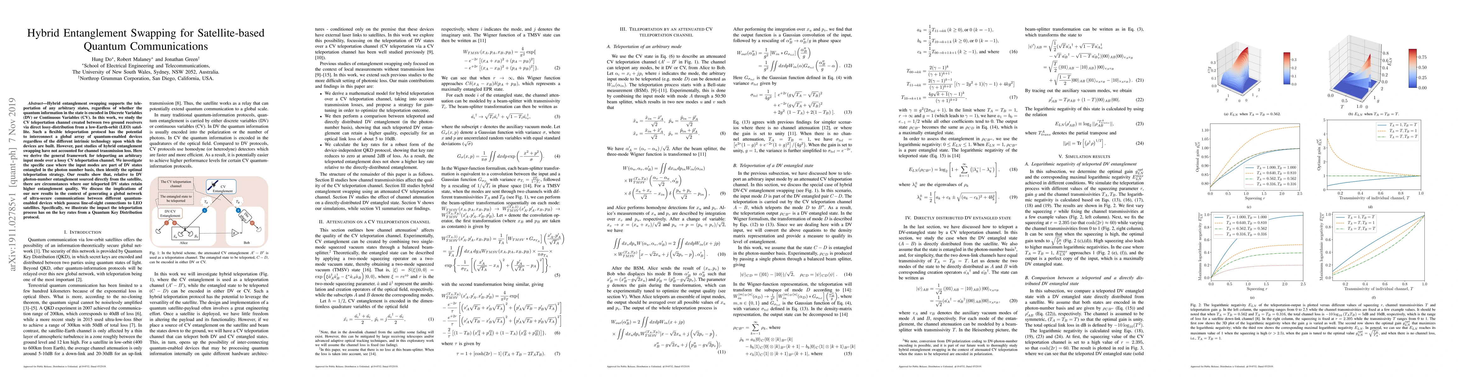 This paper investigates hybrid entanglement swapping for satellite-based quantum communications, demonstrating how CV teleportation channels can be used to transmit quantum information over lossy links from low-Earth-orbit satellites to ground receivers. It highlights that under certain conditions, the teleportation of Discrete Variable states can achieve higher entanglement quality than direct satellite transmission, which has implications for establishing secure global quantum communication networks.