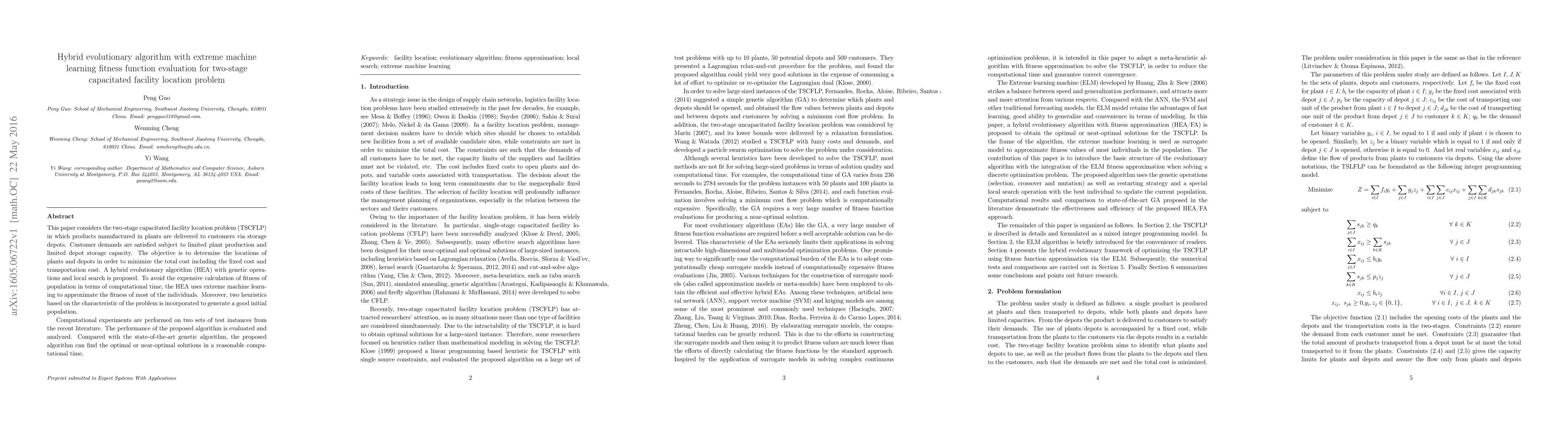 This paper proposes a hybrid evolutionary algorithm (HEA) for the two-stage capacitated facility location problem (TSCFLP), incorporating extreme machine learning to approximate fitness and heuristics for initial population. Computational experiments show the HEA outperforms state-of-the-art genetic algorithms in finding optimal solutions within reasonable time.