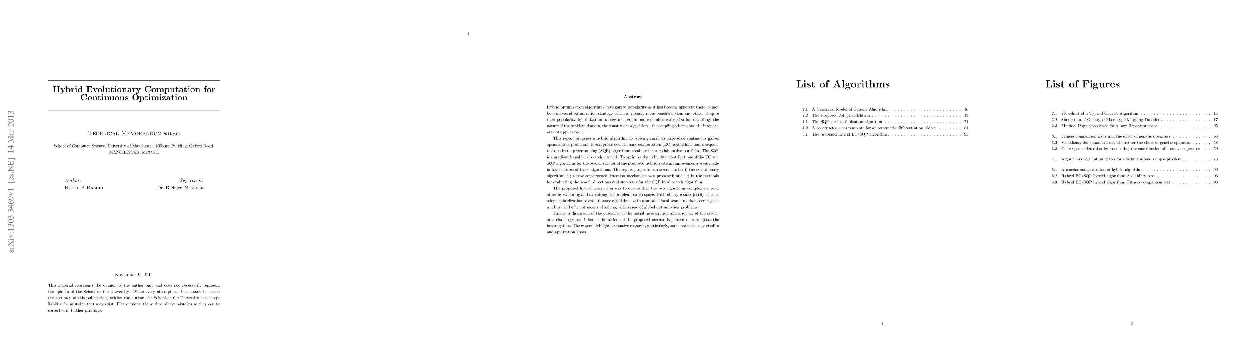 Hybrid optimization algorithms have gained popularity as it has become apparent there cannot be a universal optimization strategy which is globally more beneficial than any other. Despite their popularity, hybridization frameworks require more detailed categorization regarding: the nature of the problem domain, the constituent algorithms, the coupling schema and the intended area of application. This report proposes a hybrid algorithm for solving small to large-scale continuous global optimization problems. It comprises evolutionary computation (EC) algorithms and a sequential quadratic programming (SQP) algorithm; combined in a collaborative portfolio. The SQP is a gradient based local search method. To optimize the individual contributions of the EC and SQP algorithms for the overall success of the proposed hybrid system, improvements were made in key features of these algorithms. The report proposes enhancements in: i) the evolutionary algorithm, ii) a new convergence detection mechanism was proposed; and iii) in the methods for evaluating the search directions and step sizes for the SQP local search algorithm. The proposed hybrid design aim was to ensure that the two algorithms complement each other by exploring and exploiting the problem search space. Preliminary results justify that an adept hybridization of evolutionary algorithms with a suitable local search method, could yield a robust and efficient means of solving wide range of global optimization problems. Finally, a discussion of the outcomes of the initial investigation and a review of the associated challenges and inherent limitations of the proposed method is presented to complete the investigation. The report highlights extensive research, particularly, some potential case studies and application areas.
