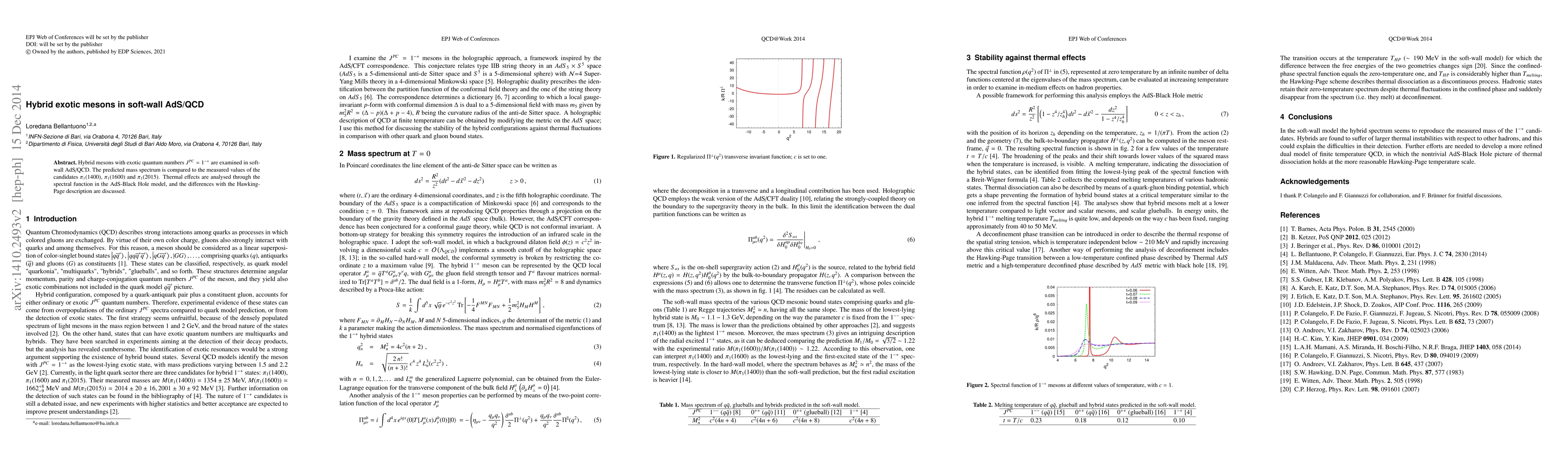 This paper investigates hybrid exotic mesons in soft-wall AdS/QCD, comparing their predicted mass spectrum to experimental candidates $\pi_1(1400)$, $\pi_1(1600)$, and $\pi_1(2015)$. It also analyzes thermal effects via the spectral function in the AdS-Black Hole model and contrasts these findings with the Hawking-Page transition.