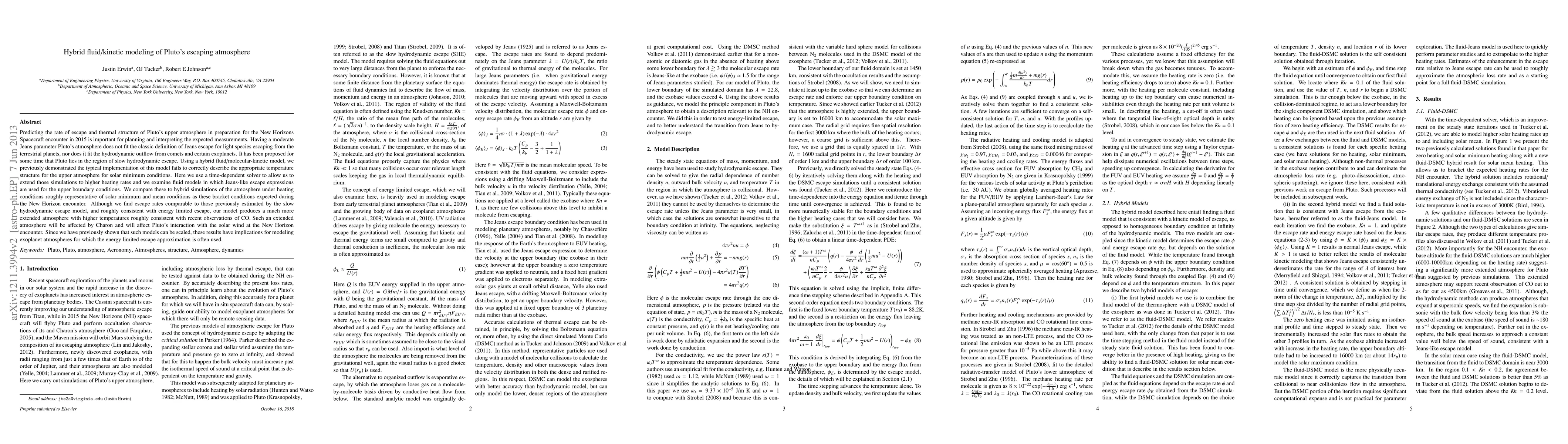 This paper employs a hybrid fluid/kinetic model to predict Pluto's atmospheric escape rate and thermal structure, finding that the atmosphere is more extended and warmer than expected, which will influence interactions with Charon and the solar wind during the New Horizons encounter. The study also highlights the model's applicability to exoplanet atmospheres.