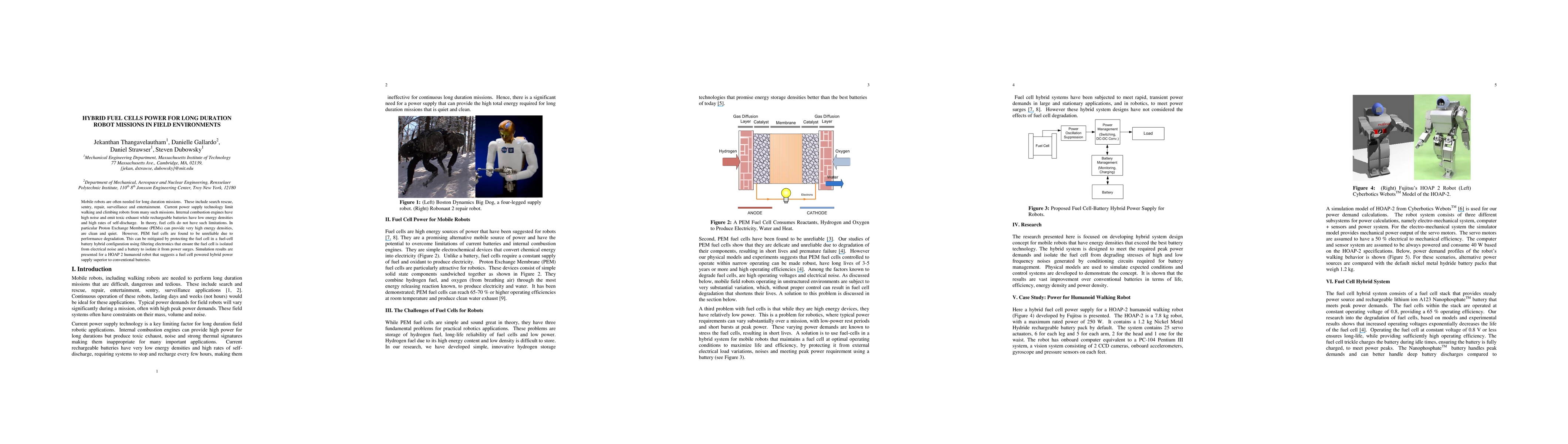 This paper explores hybrid fuel cell power systems for long-duration mobile robot missions, addressing the limitations of current power supplies. It proposes a Proton Exchange Membrane fuel cell combined with a battery in a hybrid configuration to enhance reliability and performance, demonstrating superior results in simulations for a humanoid robot.