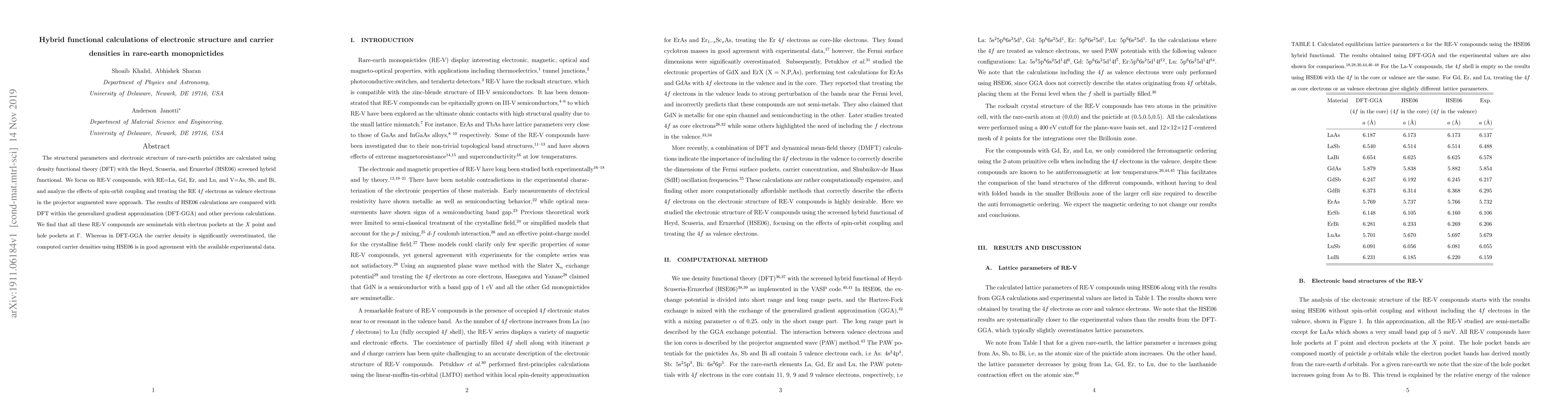 This paper uses HSE06 hybrid functional calculations to determine the electronic structure and carrier densities in rare-earth monopnictides, finding that these compounds are semimetals. Compared to DFT-GGA, HSE06 provides more accurate carrier density estimates that align well with experimental data.