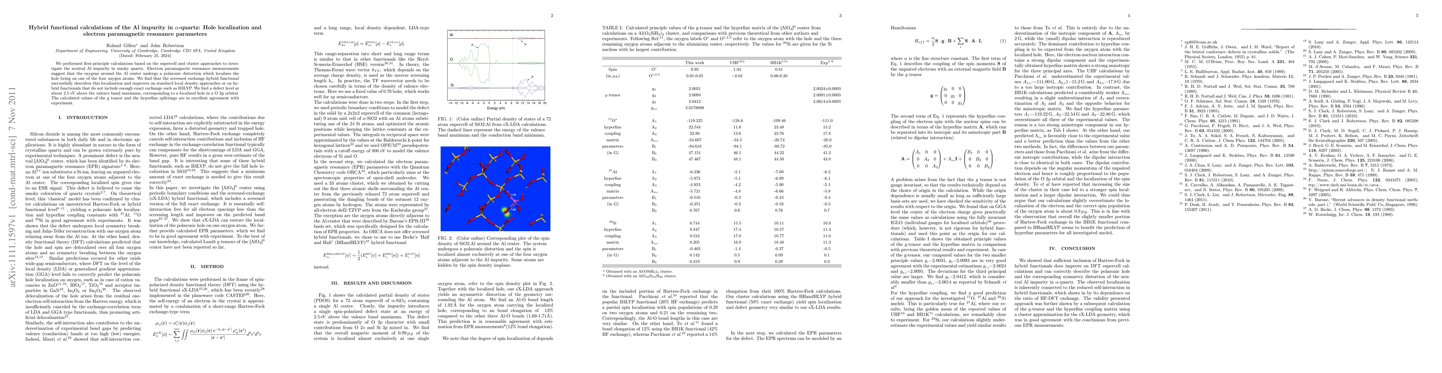 We performed first-principle calculations based on the supercell and cluster approaches to investigate the neutral Al impurity in smoky quartz. Electron paramagnetic resonance measurements suggest that the oxygens around the Al center undergo a polaronic distortion which localizes the hole being on one of the four oxygen atoms. We find that the screened exchange hybrid functional successfully describes this localization and improves on standard local density approaches or on hybrid functionals that do not include enough exact exchange such as B3LYP. We find a defect level at about 2.5 eV above the valence band maximum, corresponding to a localized hole in a O 2p orbital. The calculated values of the g tensor and the hyperfine splittings are in excellent agreement with experiment.