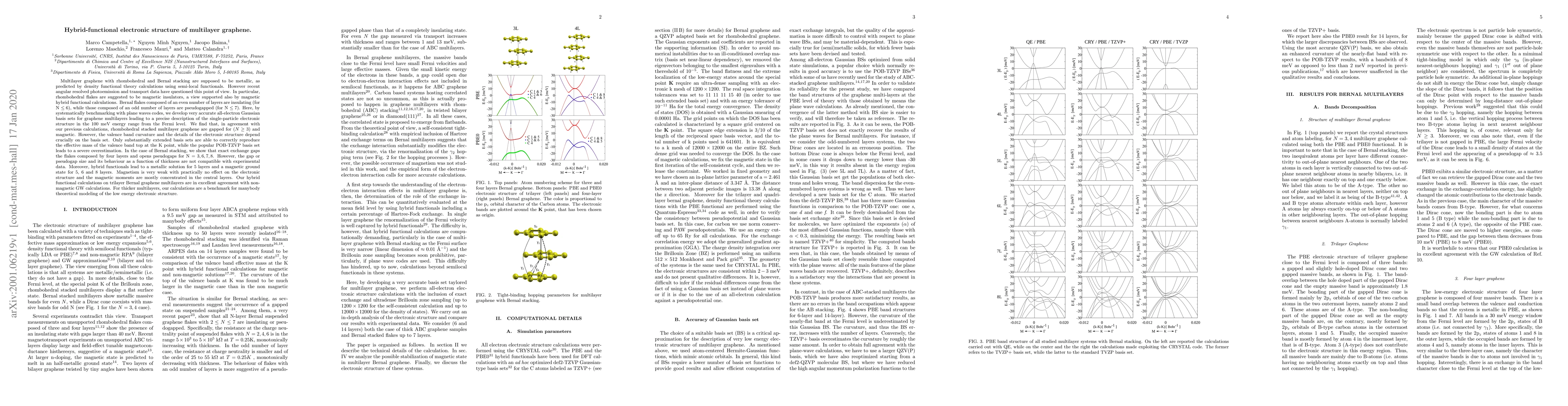 This research refines the electronic structure of multilayer graphene using hybrid-functional calculations and all-electron Gaussian basis sets, revealing rhombohedral stacking as gapped and magnetic while Bernal stacking exhibits insulating or pseudogapped behavior depending on layer count, with hybrid functionals predicting weak magnetism and metallic states for certain configurations.