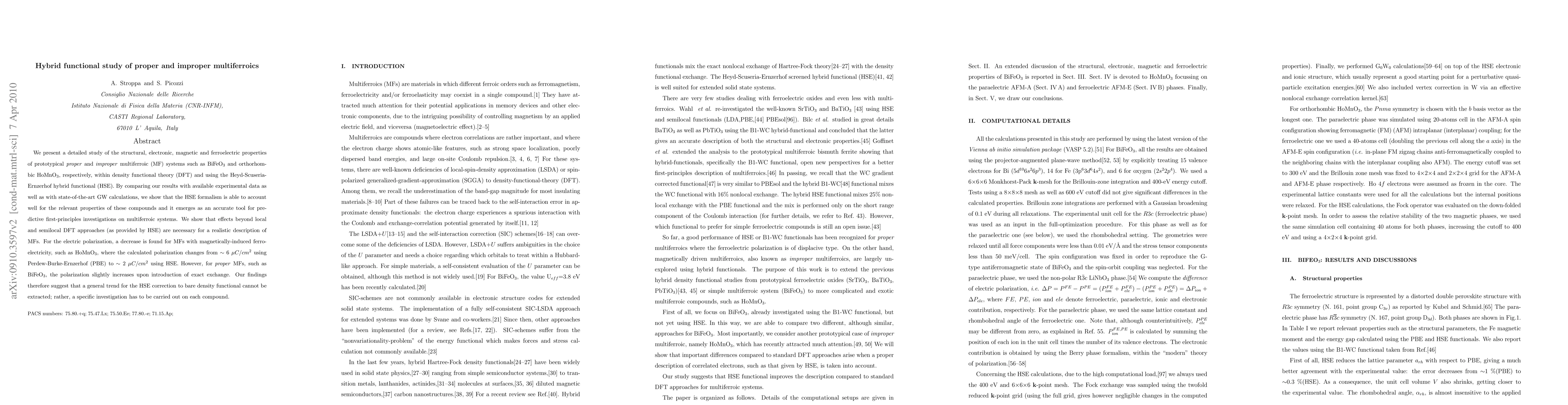 We present a detailed study of the structural, electronic, magnetic and ferroelectric properties of prototypical \textit{proper} and \textit{improper} multiferroic (MF) systems such as BiFeO$_{3}$ and orthorhombic HoMnO$_{3}$, respectively, within density functional theory (DFT) and using the Heyd-Scuseria-Ernzerhof hybrid functional (HSE). By comparing our results with available experimental data as well as with state-of-the-art GW calculations, we show that the HSE formalism is able to account well for the relevant properties of these compounds and it emerges as an accurate tool for predictive first-principles investigations on multiferroic systems. We show that effects beyond local and semilocal DFT approaches (as provided by HSE) are necessary for a realistic description of MFs. For the electric polarization, a decrease is found for MFs with magnetically-induced ferroelectricity, such as HoMnO$_3$, where the calculated polarization changes from $\sim$ 6 $\mu C/cm^2$ using Perdew-Burke-Ernzerhof (PBE) to $\sim$ 2 $\mu C/cm^2$ using HSE. However, for \textit{proper} MFs, such as BiFeO$_{3}$, the polarization slightly increases upon introduction of exact exchange. Our findings therefore suggest that a general trend for the HSE correction to bare density functional cannot be extracted; rather, a specific investigation has to be carried out on each compound.