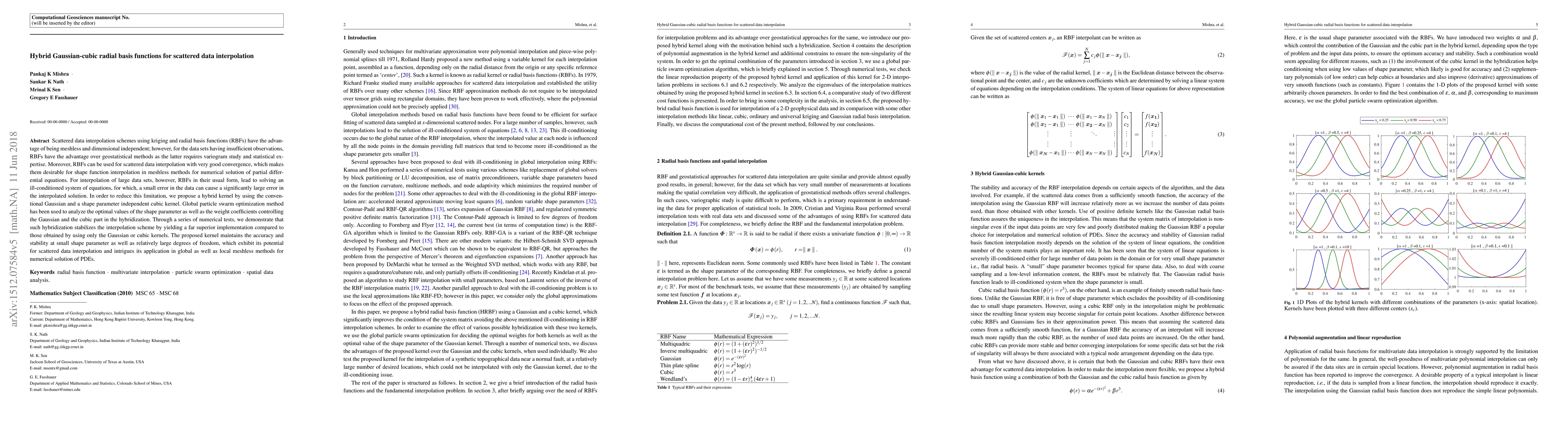 This paper proposes a hybrid Gaussian-cubic radial basis function for scattered data interpolation, addressing the ill-conditioning issue of traditional RBFs. The hybrid kernel, optimized using global particle swarm optimization, stabilizes the interpolation scheme, demonstrating superior accuracy and stability compared to using Gaussian or cubic kernels alone.