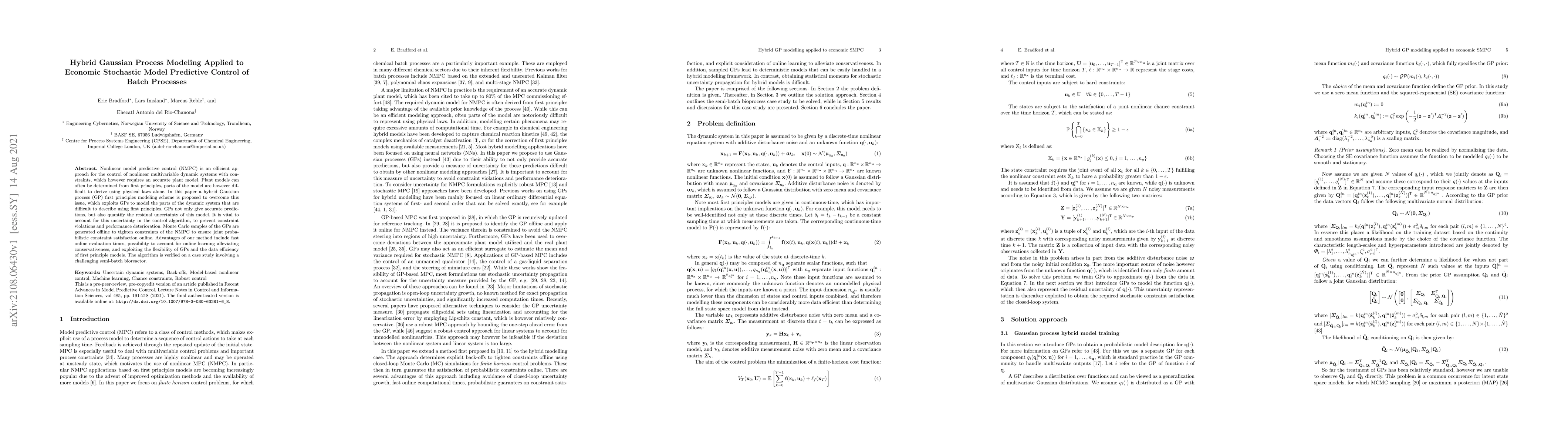 This paper proposes a hybrid Gaussian process modeling scheme to enhance nonlinear model predictive control for batch processes, combining first principles with GPs to accurately model complex dynamics. The approach ensures probabilistic constraint satisfaction in control by accounting for model uncertainty and is demonstrated on a semi-batch bioreactor.