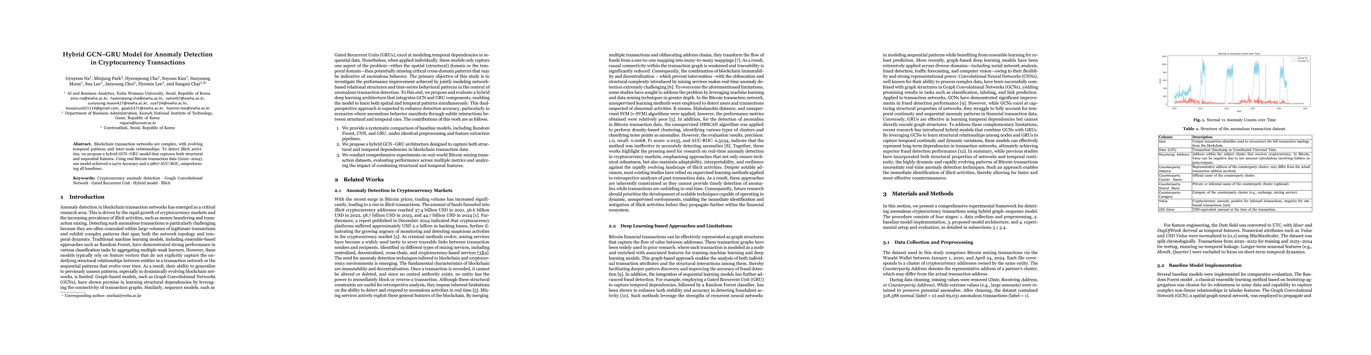 Blockchain transaction networks are complex, with evolving temporal patterns and inter-node relationships. To detect illicit activities, we propose a hybrid GCN-GRU model that captures both structural and sequential features. Using real Bitcoin transaction data (2020-2024), our model achieved 0.9470 Accuracy and 0.9807 AUC-ROC, outperforming all baselines.